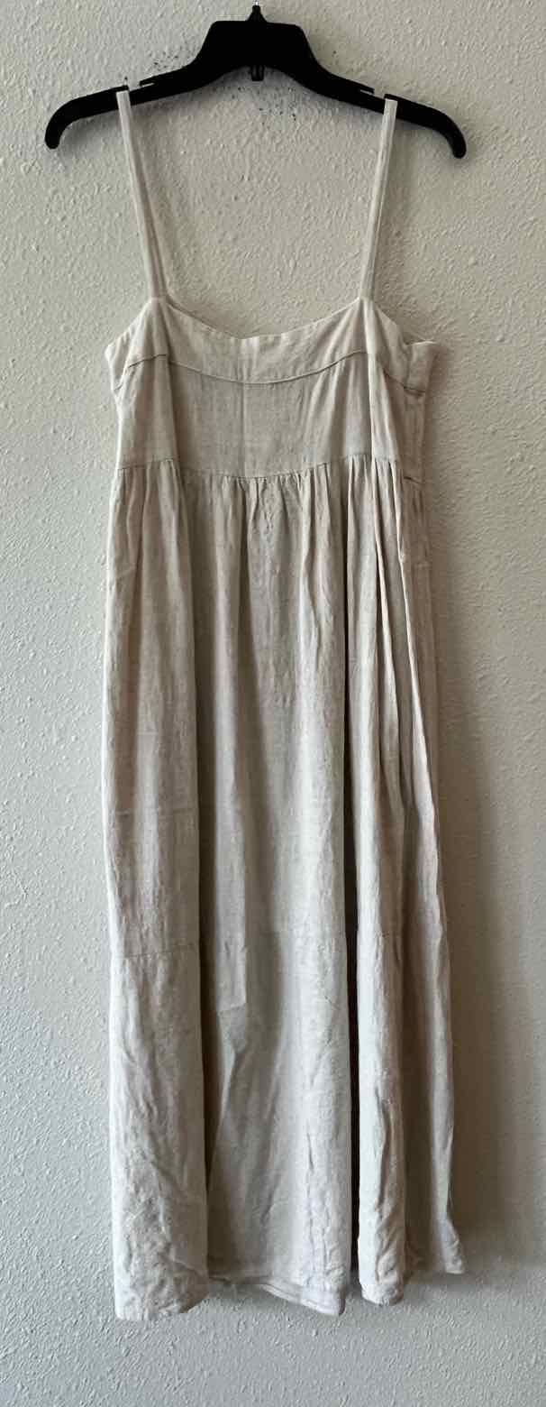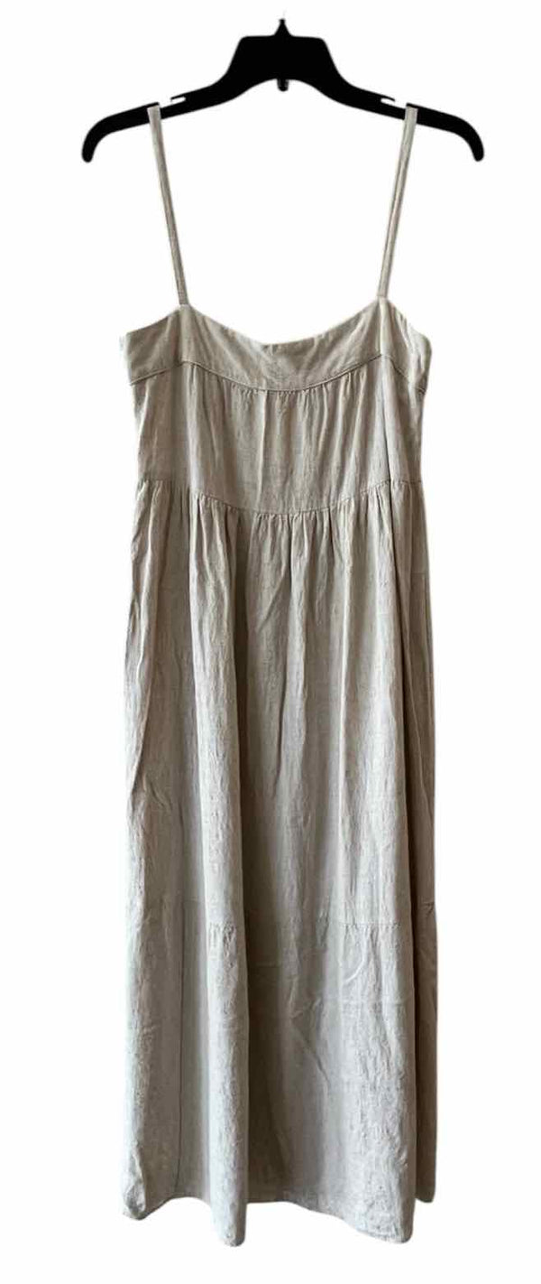 Spaghetti strap, heathered beige, textured, midi syd dress with empire waist