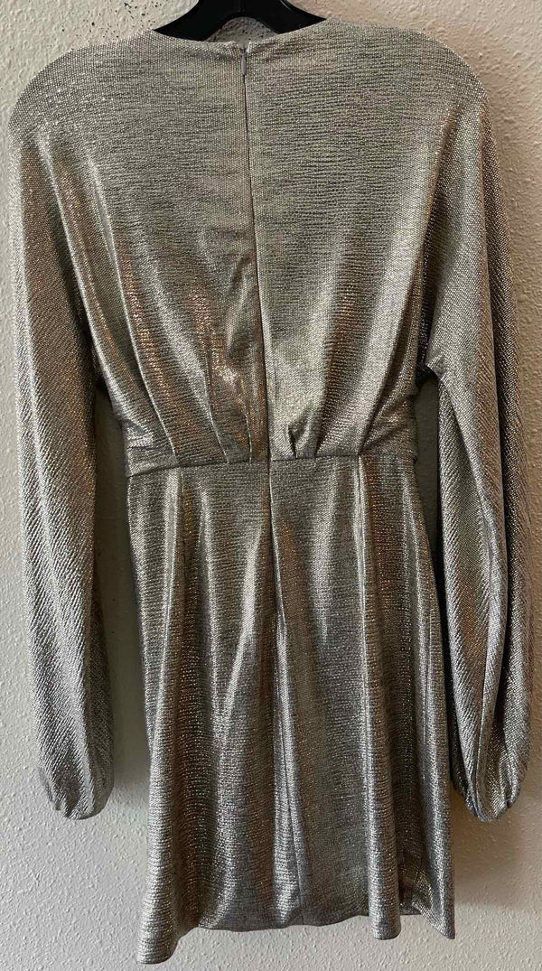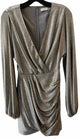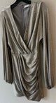 long sleeve,surplice neck,above knee,sold metallic gold,Mckenzie faux wrap mini dress.back zip closure,elastic cuff balloon sleeve,surplice bodice detail,lined