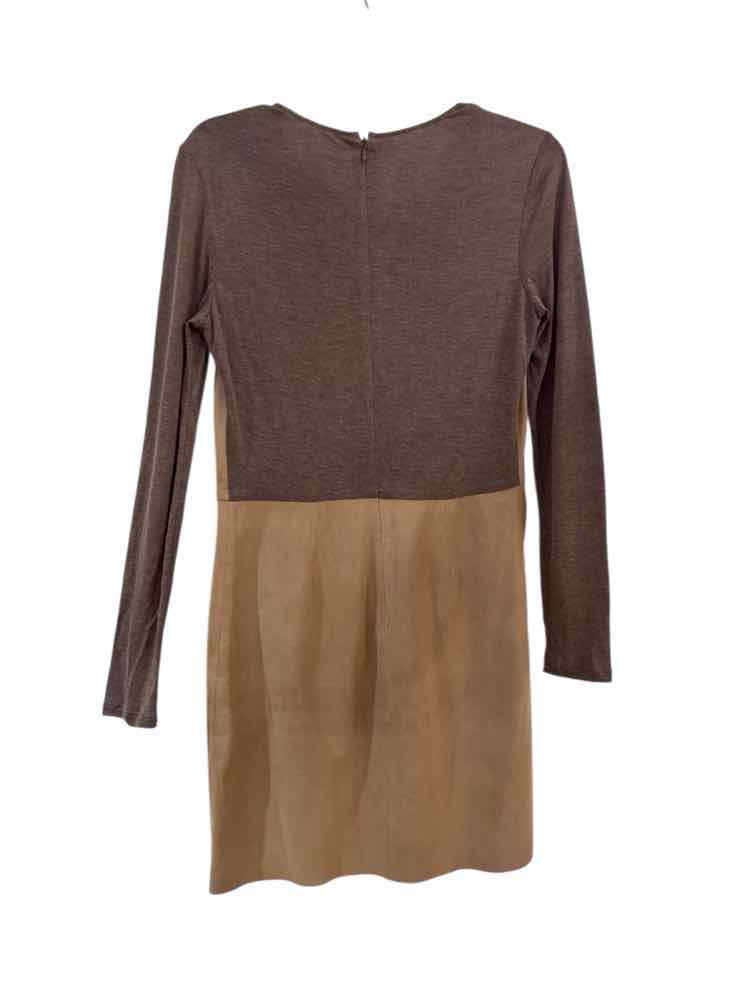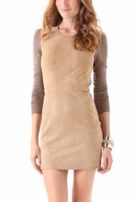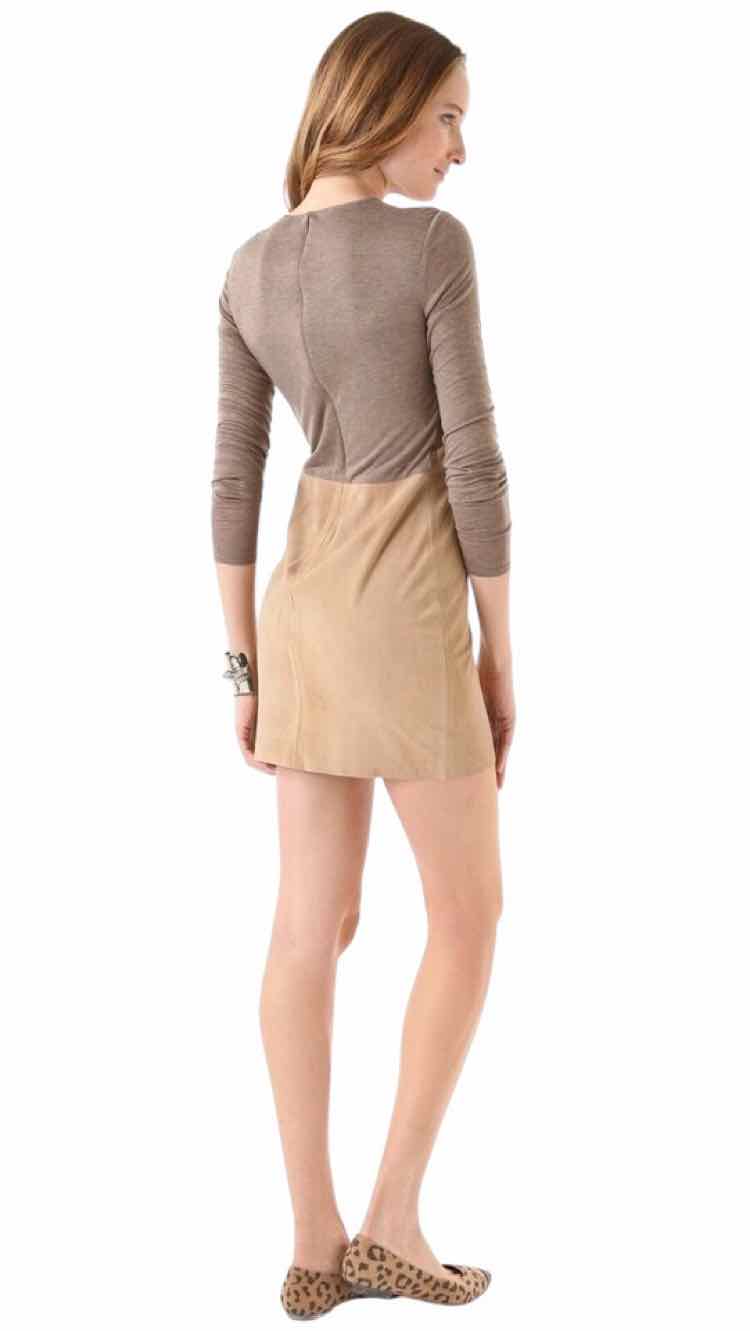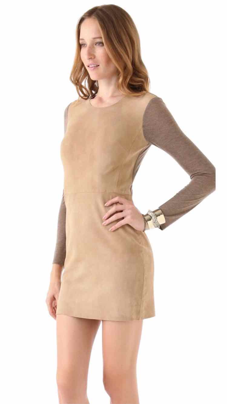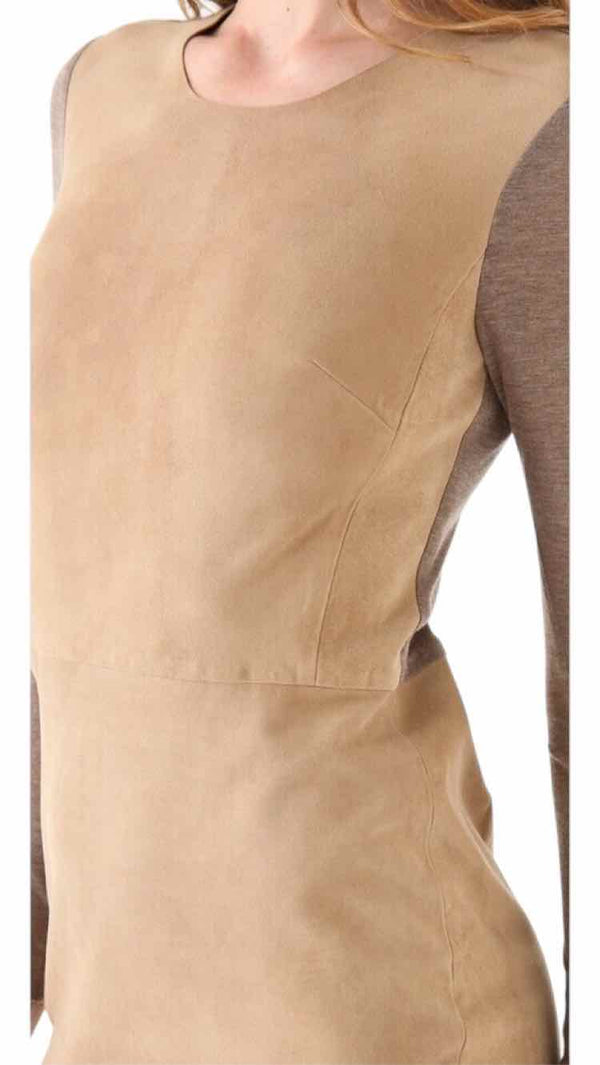 long sleeve mini dress, beige and brown sleeves, above the knee, hidden back zipper 100% GENUINE GOAT SUEDE / LEATHER , 100% COTTON