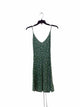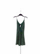 wrap mini length dress, spaghetti straps, green base and white flowers throughout, u neck line