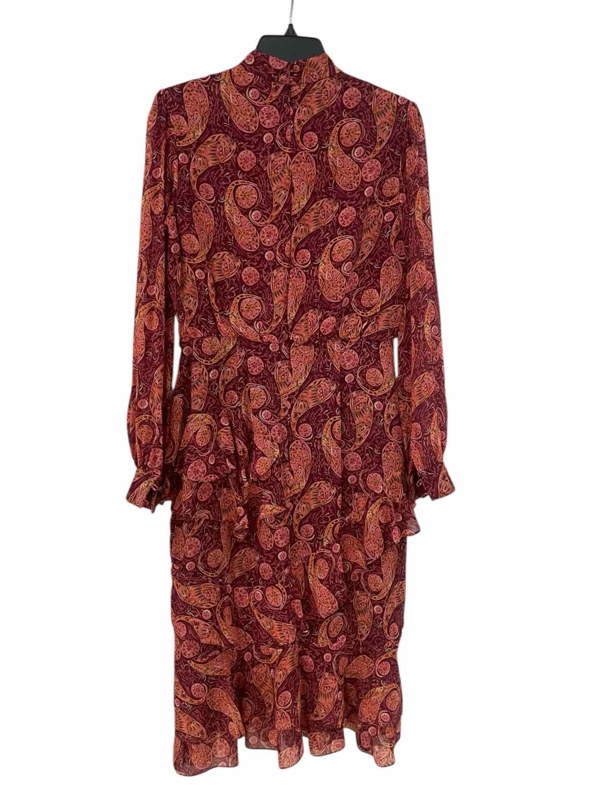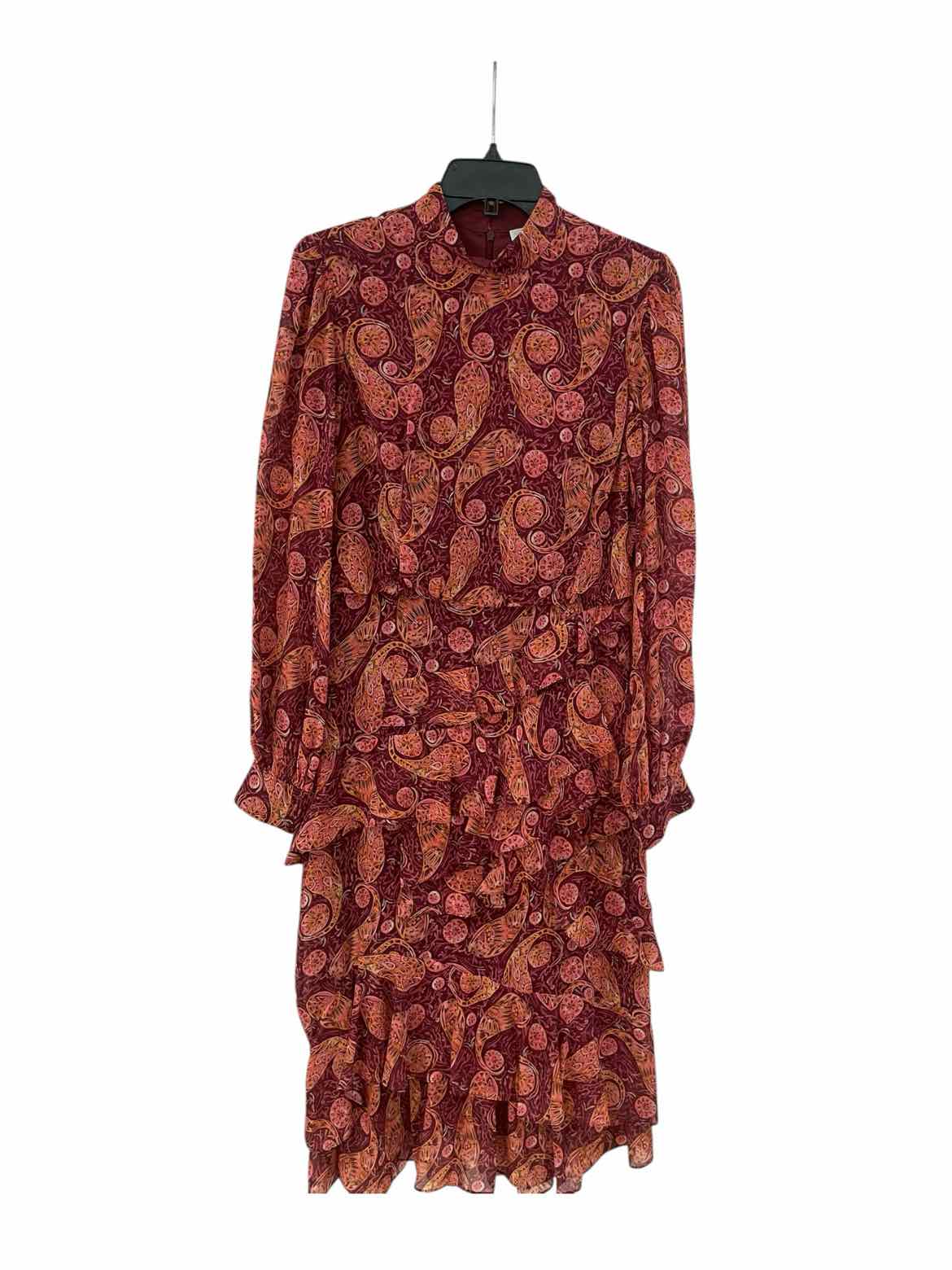Crafted from 100% silk, the Saloni Pink/Orange Size 8 Dress brings refined charm to authentic luxury resale. This pre-loved designer dress features a long sleeve, high neck silhouette with sheer sleeves and covered buttons at the wrist and neck for a polished finish. The deep pink and orange paisley pattern, combined with the ruffle skirt and midi length, creates a unique look for women's consignment fashion. Carefully curated in good condition, this dress is an exceptional find for those seeking designer details and beautiful color.