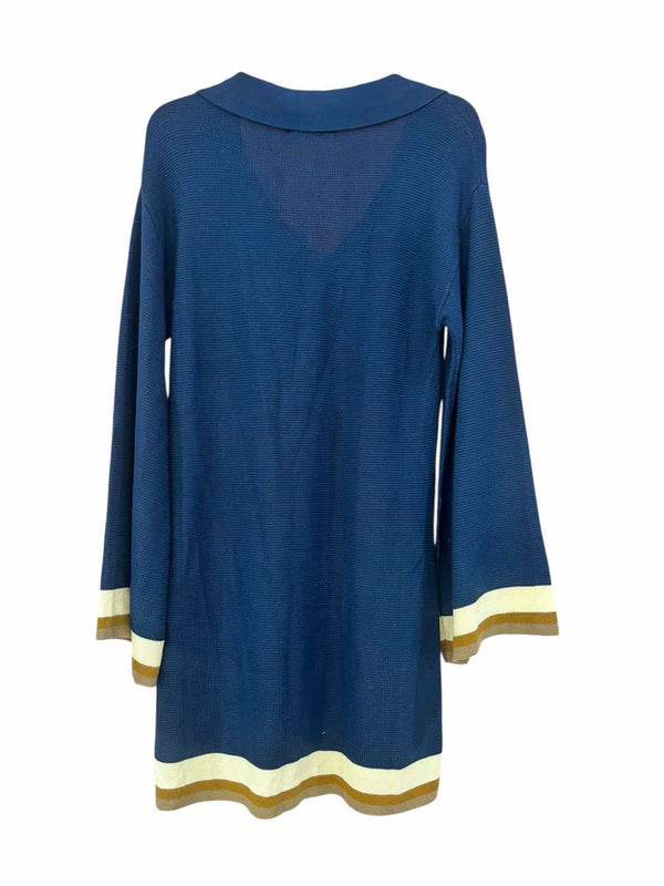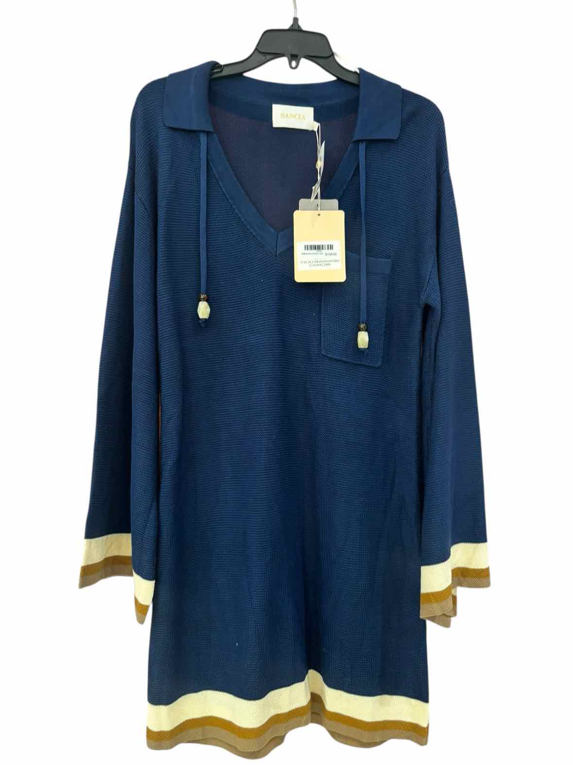 The color and pattern of the Sancia navy multi Size M Dress bring a fresh perspective to authentic luxury resale and pre-loved designer fashion. This chic knit dress combines navy with white and brown accents for a distinctive look, while its eye-catching V-neckline is enhanced by tassels adorned with white and brown stones. A convenient front pocket and striped details on the hem and cuffs add refined finishing touches, making it a polished option in women's consignment fashion. Enjoy the confidence of owning a new-with-tags piece that blends designer appeal with contemporary style.
