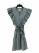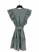 ruffle cap sleeve, button down, zip side, brown buttons, ruffle skirt, mini, tie around waist, round neck
