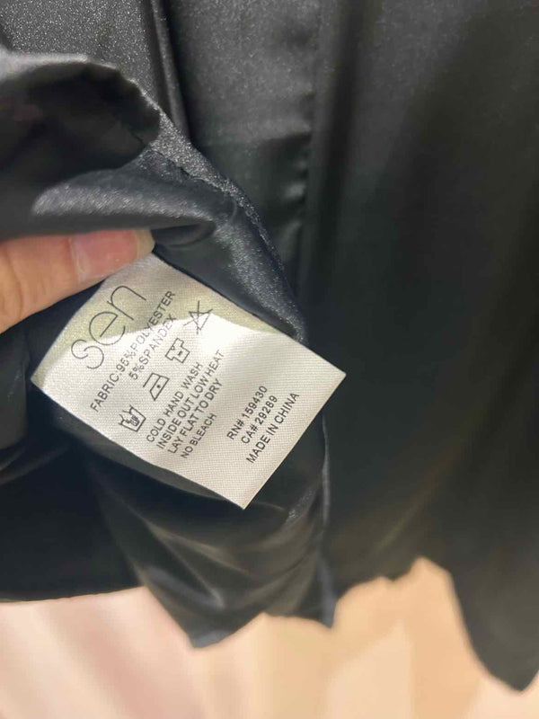The black sheen and silky finish of the Sen Black Size M Dress bring a touch of chic polish to any women’s consignment fashion collection. Crafted from a polyester blend, this pre-loved designer mini dress features a graceful V-neck front and back, complemented by winged sleeves and a loose, comfortable fit. Its lined construction and shiny, refined look make it a remarkable find in authentic luxury resale. Offered in good condition, this dress is an exceptional choice for those who appreciate unique silhouettes and versatile black essentials, curated for your wardrobe.