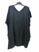 Mini, SS, V-neck, loose fit, silky look, kinda shiny, lined, sleeves look winged, back neck line is also a V