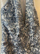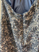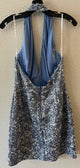 Sleeveless halter, above the knee, white with blue wire-like outline of floral design, sequins, deep vneck dress