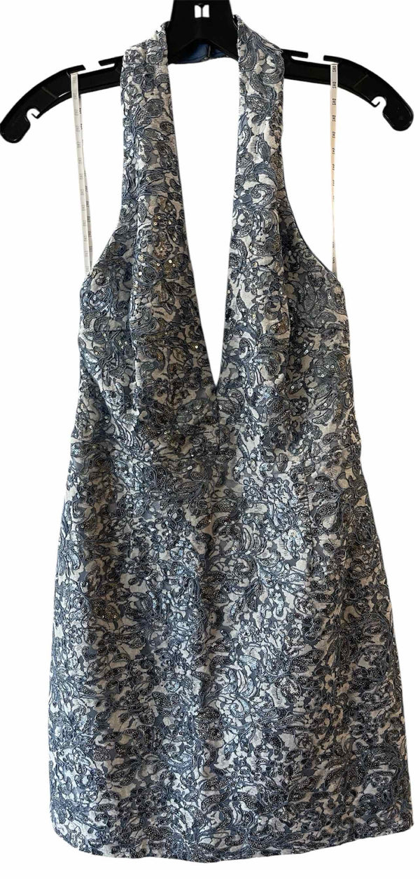 The color and pattern of the SHO Blue and White Size 10 Dress set it apart in any women's consignment fashion collection. This pre-loved designer piece features a crisp white base adorned with a blue wire-like outline of a floral design, enhanced by eye-catching sequins. The sleeveless halter silhouette and deep v-neck shape are both chic and modern, while the above-the-knee length brings a fresh, polished flair. Discover authentic luxury resale with this distinctive dress that blends SHO's refined style and quality craftsmanship, ready to transform your wardrobe with its unique details and artistic pattern.