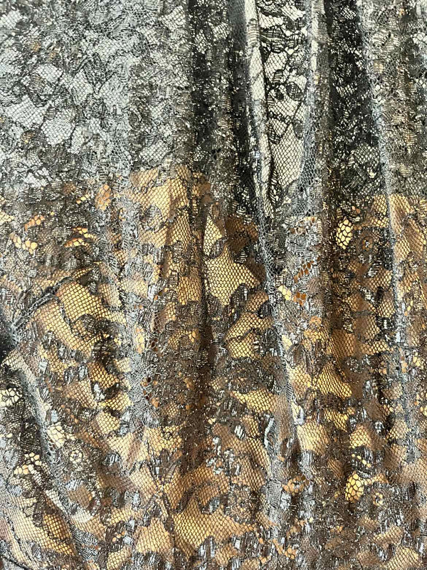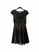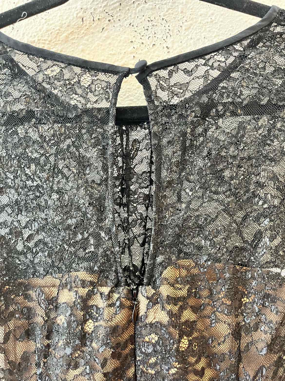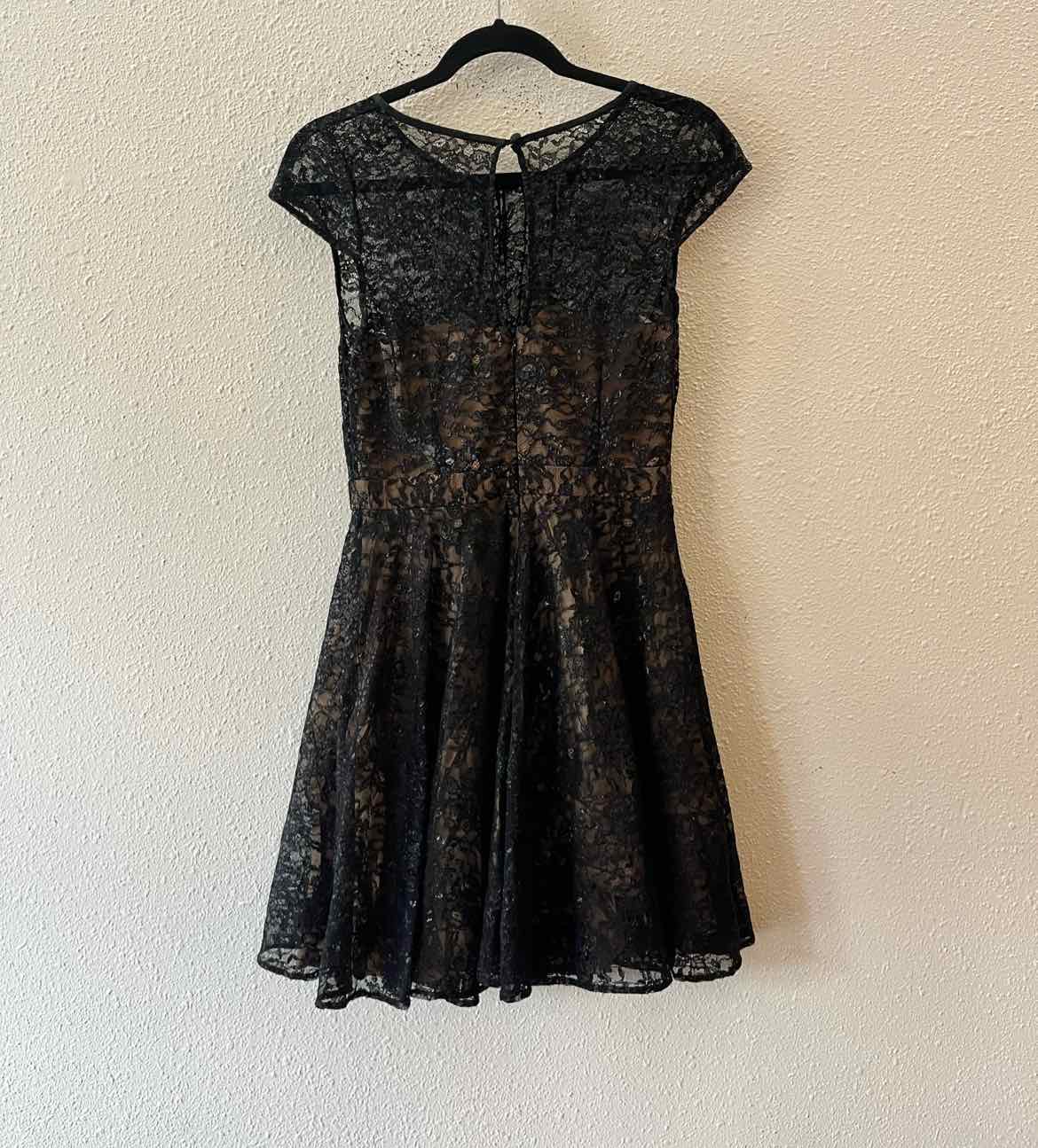 Cap sleeve, above the knee, nude with black shiny lace overlay, flare dress