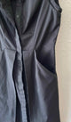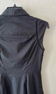 Sleeveless solid black, hidden front button, subtle laser cutout detail, shirt dress, flap detail at front skirt
