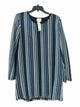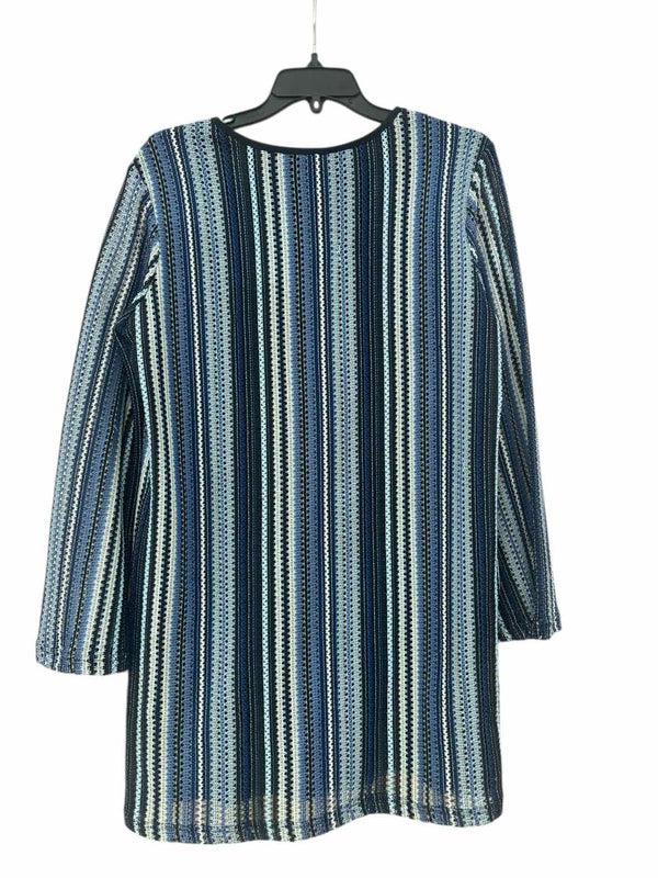 nwt- ls, round neck, different shades of blue, white and black sewn designs, mini