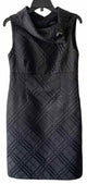 sleeveless,cowl neck,below knee,solid black,jacquard plaid shift dress,back zip closure,embellished button neck detail,lined