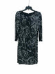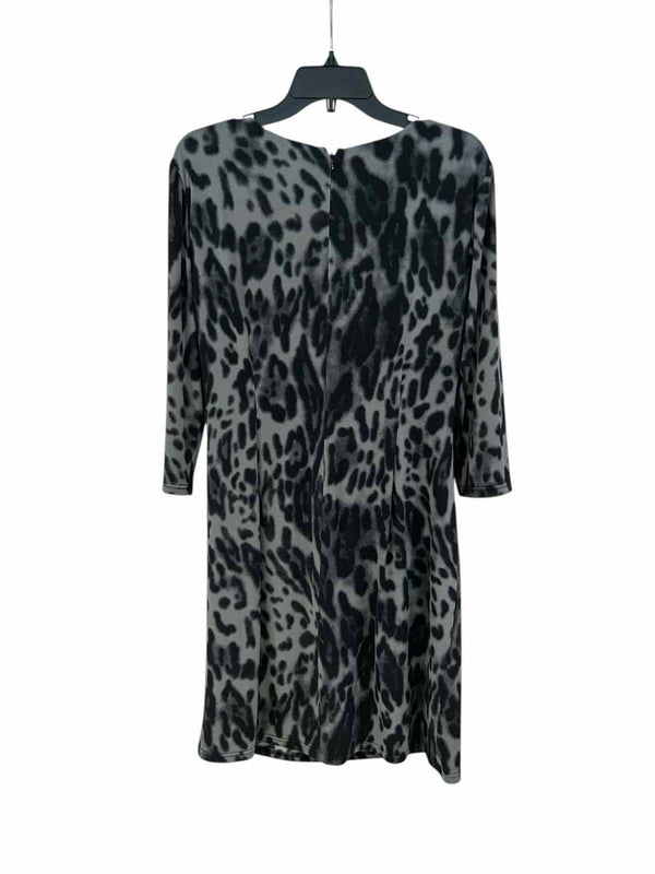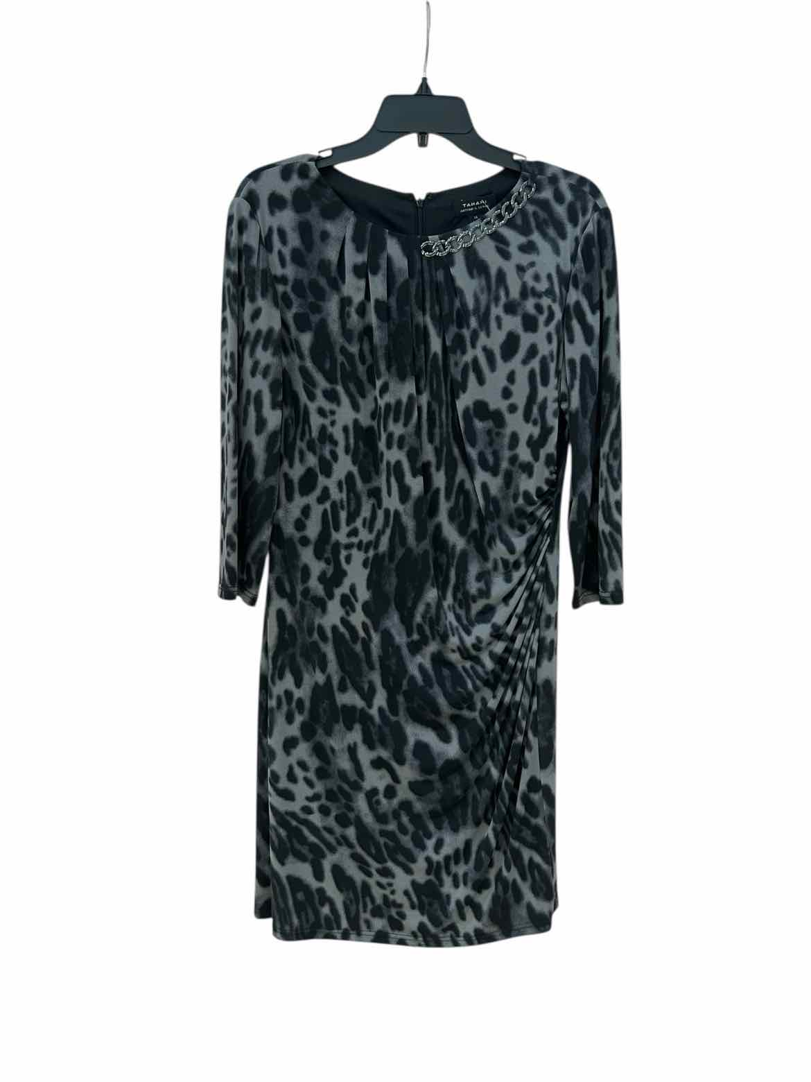 The gray leopard print of this pre-loved designer Tahari Gray Size 14 Dress brings a contemporary twist to classic women's consignment fashion. Designed in a mini silhouette with 3/4 sleeves and a round neck, this authentic luxury resale item features striking gun metal chain detail and flattering ruching at the neck and sides. The stretchy poly blend fabric and hidden back zipper ensure both comfort and a tailored fit, making this piece a distinctive addition to any curated wardrobe. Discover the unique charm and quality that comes with carefully sourced and authenticated designer resale.