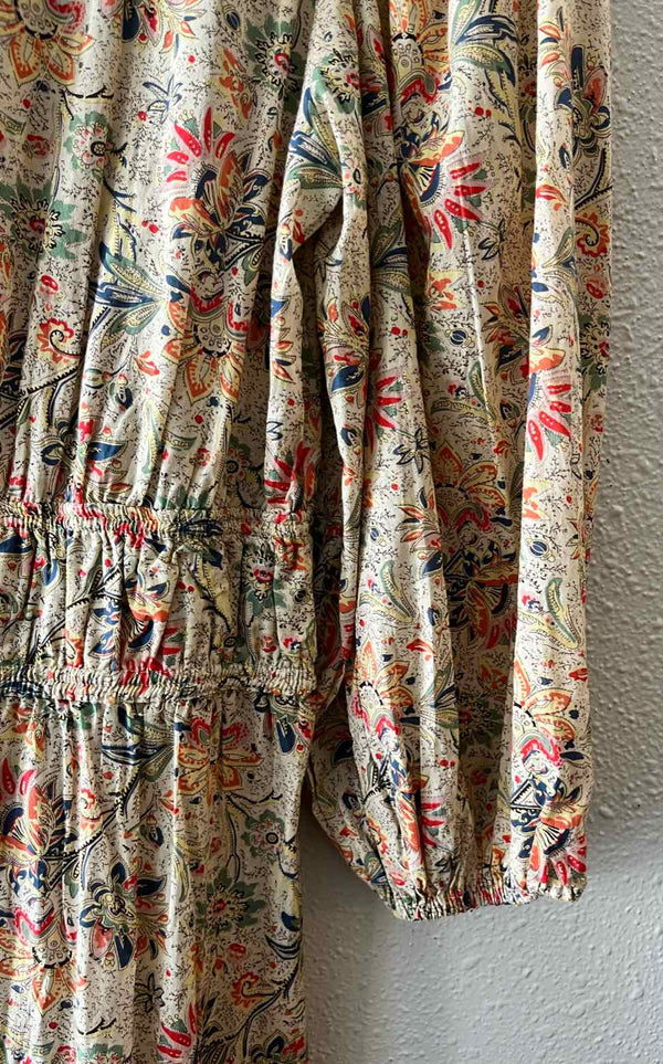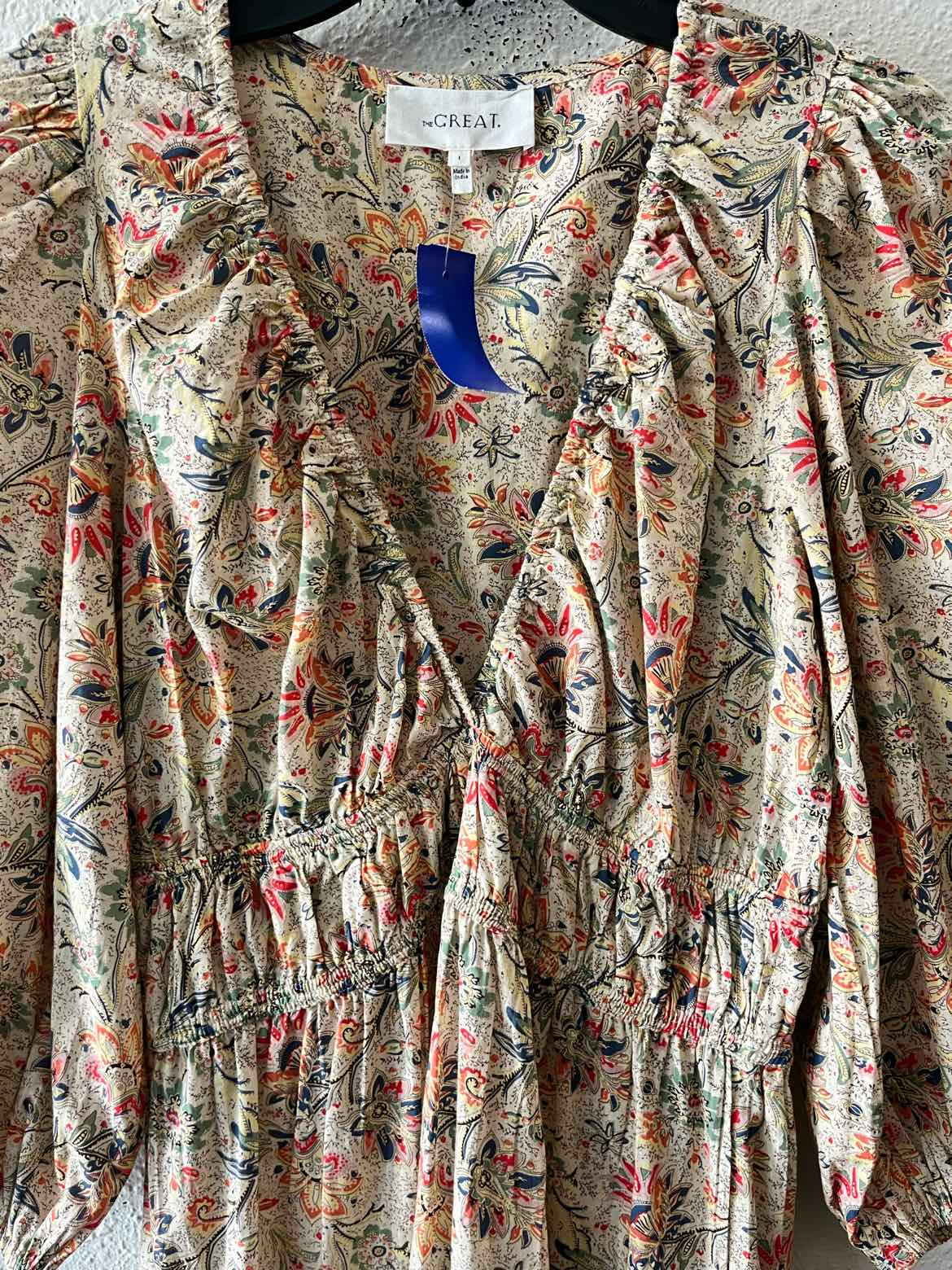 Featuring a timeless fit and flare silhouette, the The Great Cream Multi Size 1 Dress brings a vibrant twist to authentic luxury resale. This pre-loved designer piece displays a graceful cream base adorned with a multicolored floral paisley print in shades of orange, yellow, blue, black, red, lilac, and seafoam. Meticulous details like subtle brown twig-like accents, cinched paneled ruching, and soft puff sleeves enhance its feminine charm. Carefully curated for discerning women’s consignment fashion, this dress arrives in excellent condition, promising both beauty and comfort in every wear.