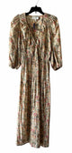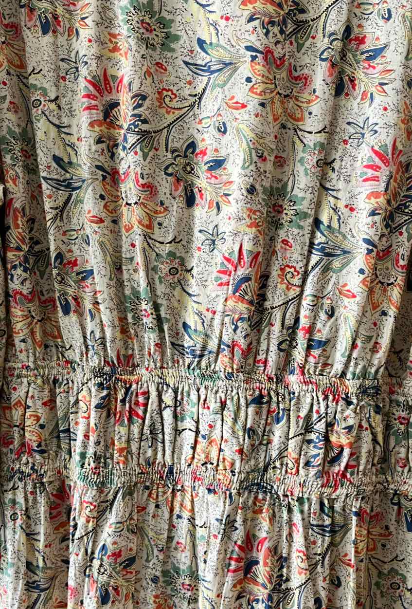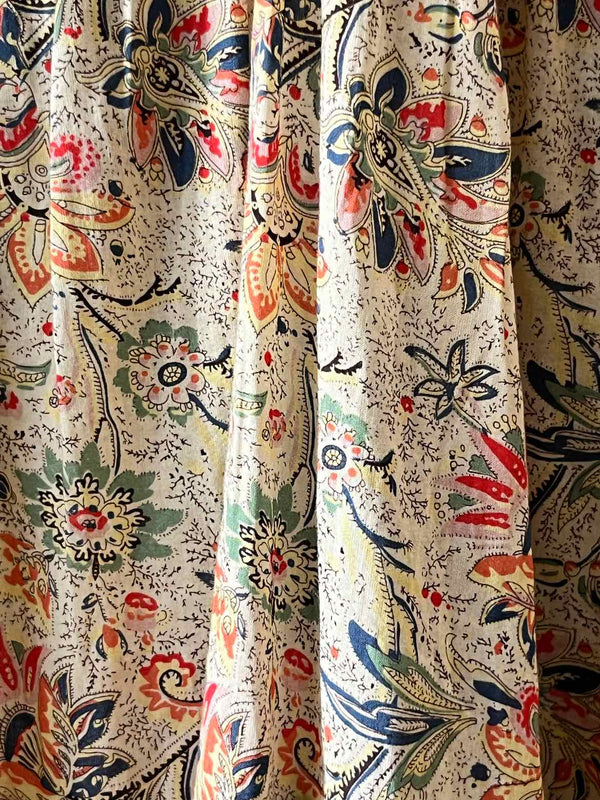Three quarter sleeve,v neck,cream fit and flare maxi dress,multicolored floral paisley design,orange,yellow,blue,black,red,lilac,seafoam,subtle thin brown twig like design throughout,cinched paneled ruching under bust and around neckline,puff sleeves