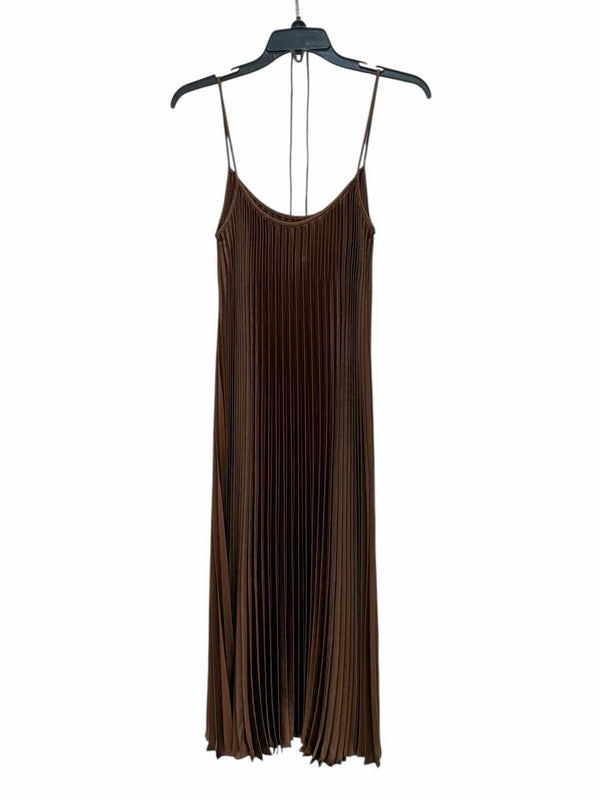 The bronze hue of the Vince Bronze Size M Dress brings a warm, eye-catching element to your wardrobe. This pre-loved designer piece from authentic luxury resale showcases a beautiful midi silhouette with delicate spaghetti straps and a cord belt for a tailored fit. Large vertical pleating adds dimension and a refined touch, making this women's consignment fashion find both modern and timeless. Crafted from 100% polyester, it offers a lightweight feel in size M. Add this unique Vince dress to your curated collection for an elevated, polished look.