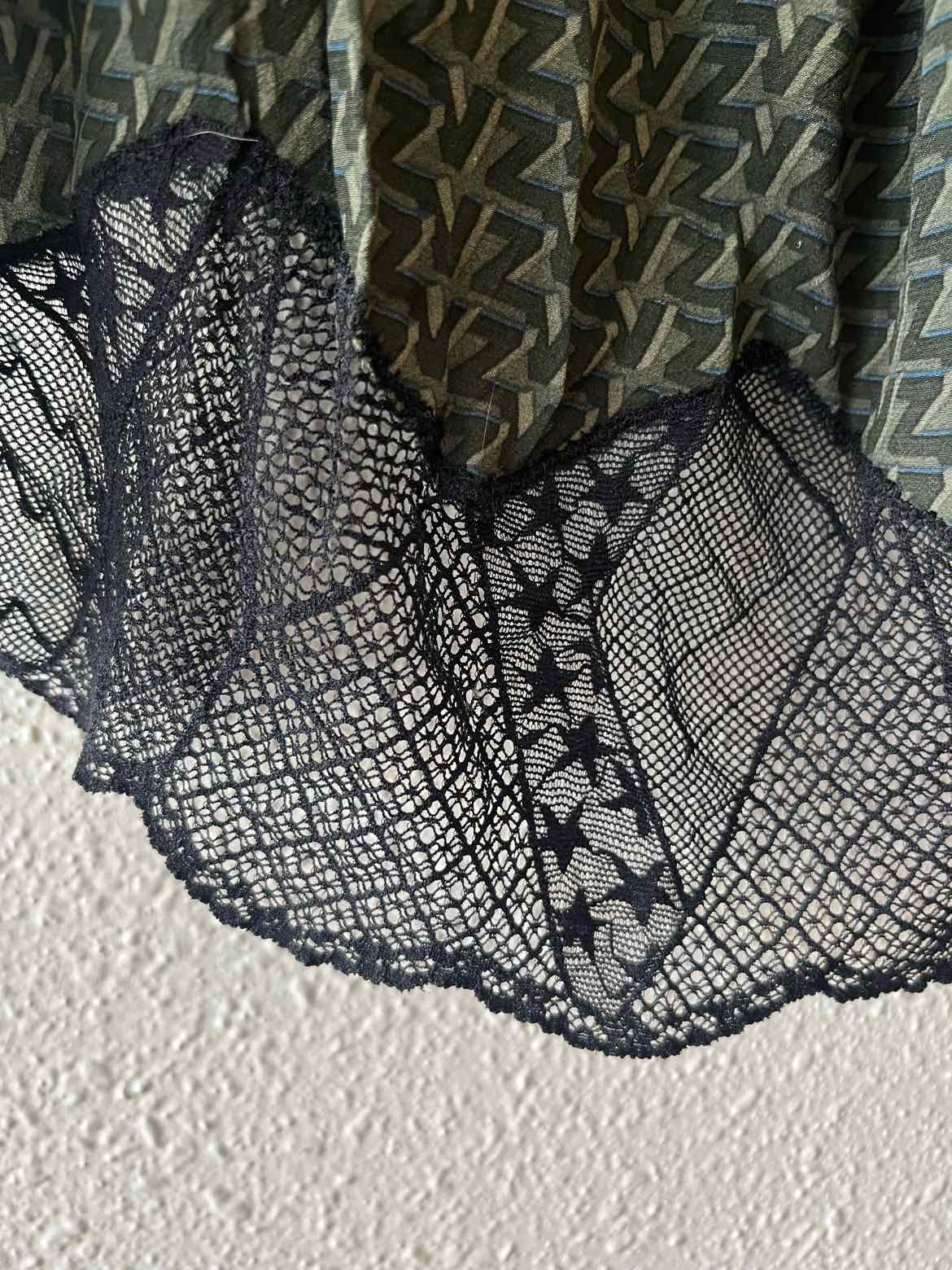 high rise,be low knee,green multi,Joslin logo printed lace midi skirt,elastic backband,on seam pockets,lace trim hem