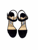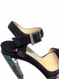 Suede/ gloss elaphe with marble style heel, open toe, ankle strap, suede black throughout, gold hardware
