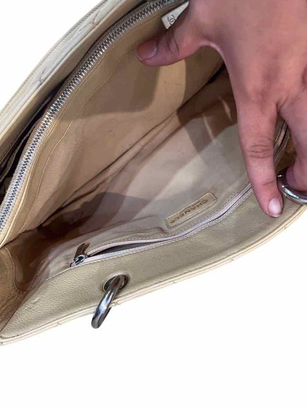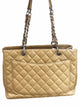 solid beige quilted caviar leather, CC embossed logo front, pocket slot back, silver chain handles and hardware, medium size rectangular bag