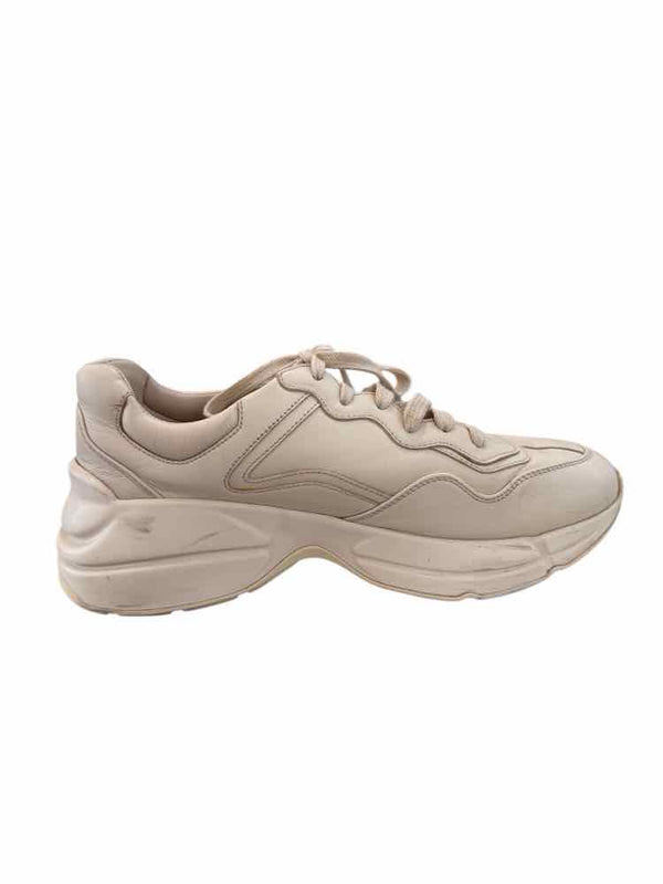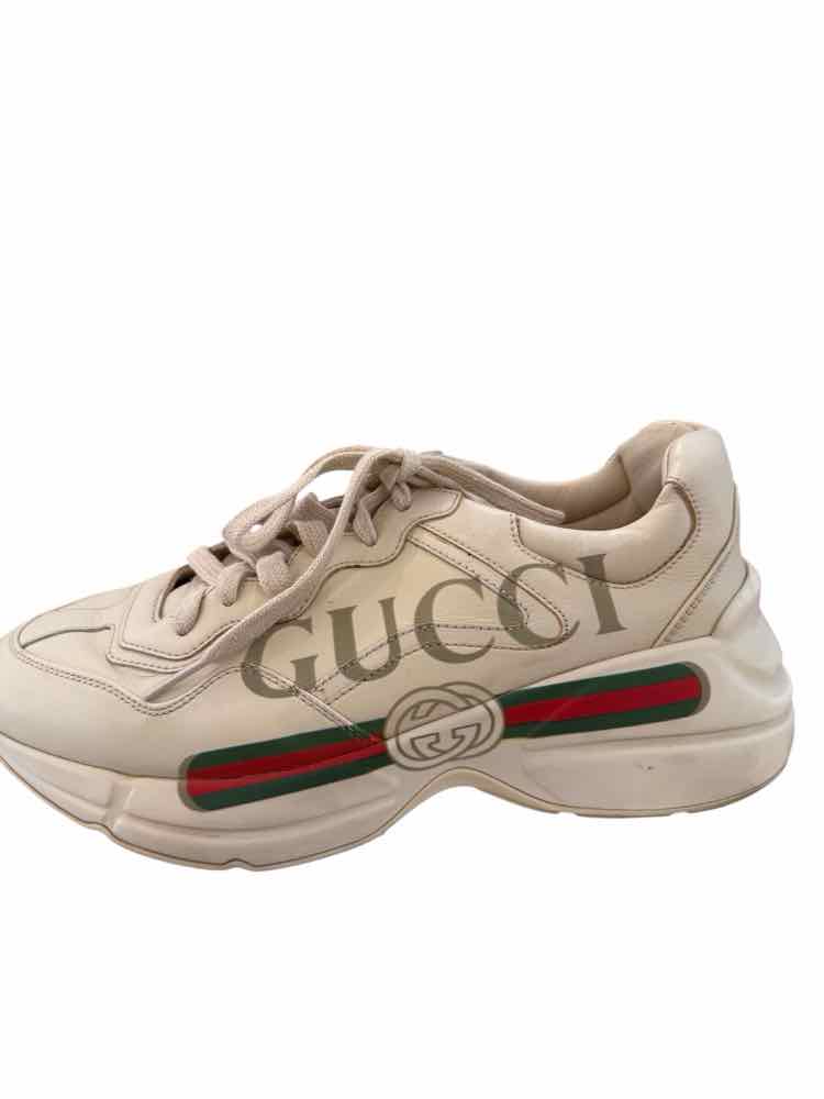 The cream, red, and green tones of these Gucci cream red and green Size 38.5 Shoes bring a distinctive touch to any curated wardrobe. Designed with the iconic Rhyton leather sneaker logo and a slightly thick platform, this pre-loved designer piece reflects the refined style of authentic luxury resale. In very good condition, these women's consignment fashion sneakers deliver both comfort and a chic aesthetic. The quality craftsmanship and recognizable Gucci color palette make these shoes a unique find for those seeking timeless, branded footwear in size 38.5. Discover the appeal of genuine designer footwear with this carefully curated item.