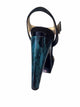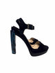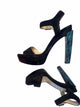 Suede/ gloss elaphe with marble style heel, open toe, ankle strap, suede black throughout, gold hardware