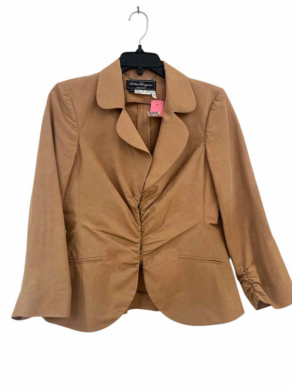 Crafted from quality cotton and finished with silk lining, this Salvatore Ferragamo Brown Size 40 Shirt delivers a refined touch to any women's consignment fashion collection. The rich brown hue, tailored rutched waist, and unique clasp waist closures define its elegant silhouette, while the blazer-inspired design and false pockets add classic charm. Sourced through authentic luxury resale, this pre-loved designer piece is in excellent condition, making it a remarkable addition for those who value timeless style and meticulous detailing.