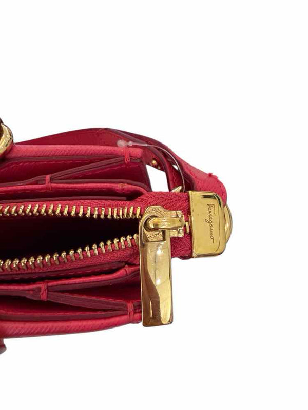 Crafted from luxurious leather, this Salvatore Ferragamo Tracy Bow Tote Hot Pink Handbag is a remarkable find in authentic luxury resale. The vibrant hot pink color brings a lively touch to any women's consignment fashion collection, while the chic bow detail and gold hardware showcase Ferragamo’s refined design sensibilities. With its small, square silhouette and practical multi-zipper pockets, this pre-loved designer accessory seamlessly blends style with everyday function. Its crossbody versatility ensures both comfort and flair, making it a unique choice for those seeking elevated designer pieces in very good condition.