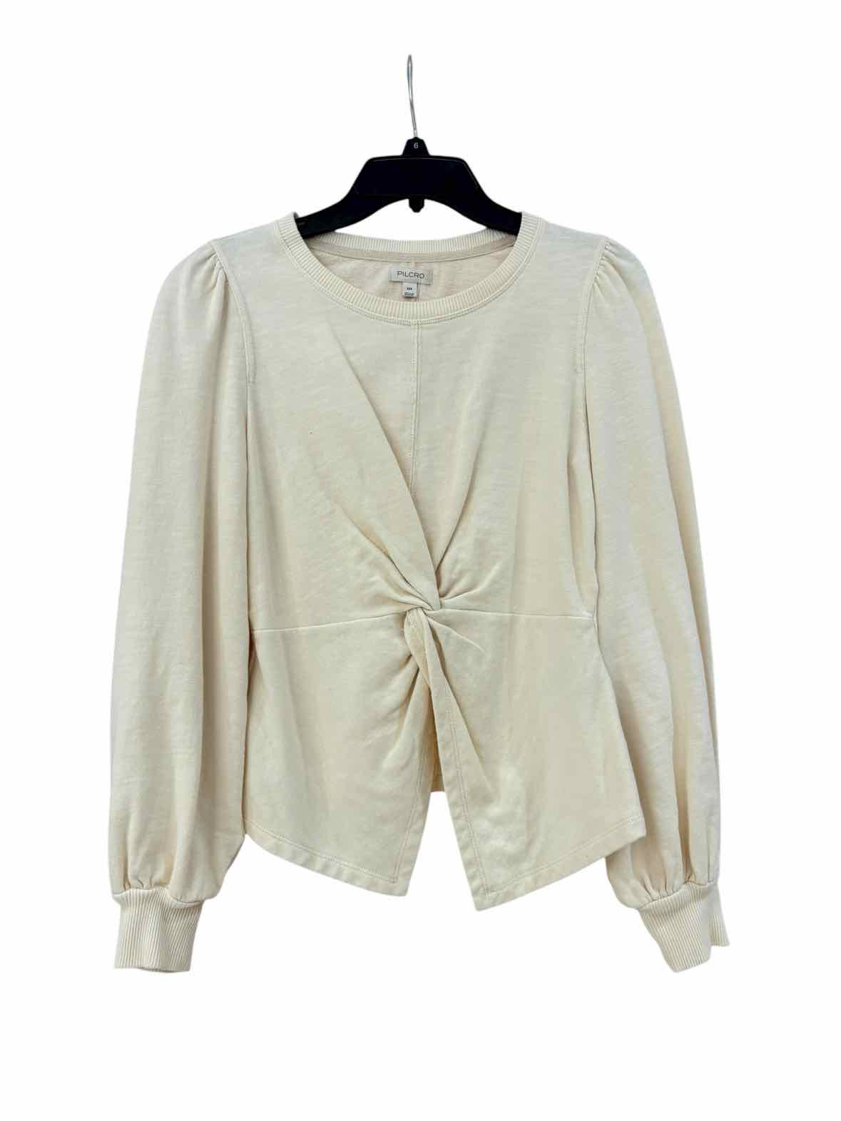 long sleeve white sweater, knit section in the center that comes down into ruffles on the bottom of shirt, knit on cuffs, round neck