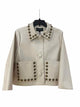 NWT, 3/4 sleeve, boxy, cropped, large bronze studs around collar and 2 front pockets, 3 large covered buttons
