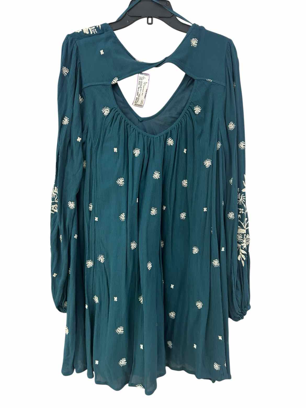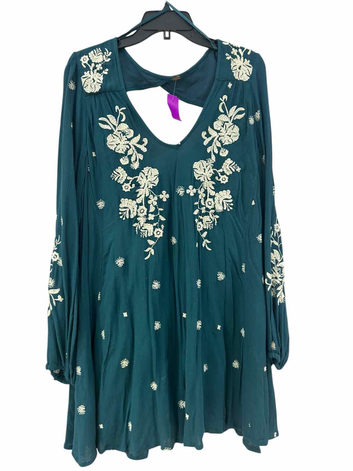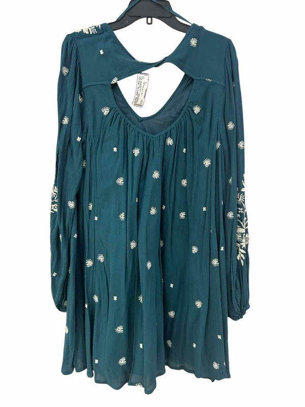 The teal hue of the Free People Teal Size No Label Dress brings a fresh pop of color to any women's consignment fashion wardrobe. This pre-loved designer mini dress features a crinkly 100% rayon fabric adorned with white embroidered florals for a distinctive, romantic touch. Designed with long sleeves, a flattering u-neckline, and a unique back cutout with elastic gathering under the keyhole, it fits like a large and offers both comfort and charm. Explore authentic luxury resale by adding this beautifully detailed piece to your collection—sourced and available from Baton Rouge.