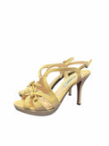 box- stiletto, strappy, buckle around ankle, bow on toe, open toe, round toe,