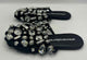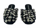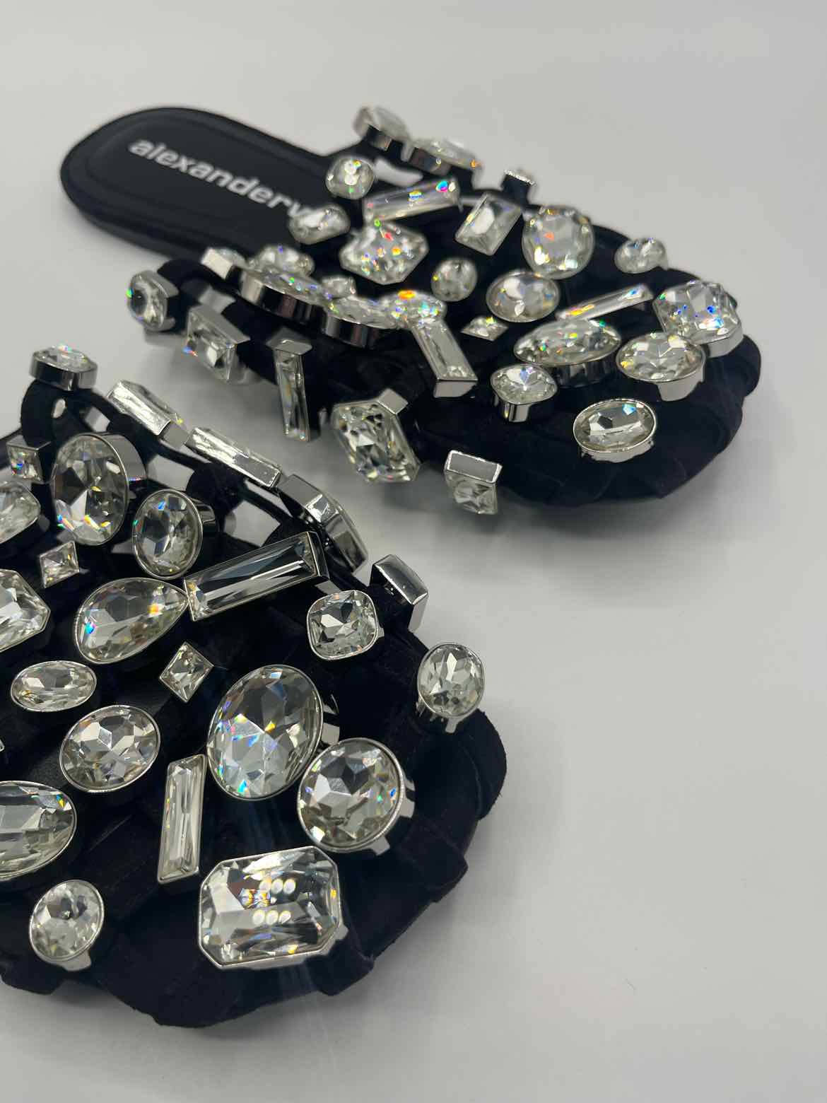 round cage toe,solid black,Amelia crystal mules,suede cage upper,logo embossed leather sole,silver crystal hardware