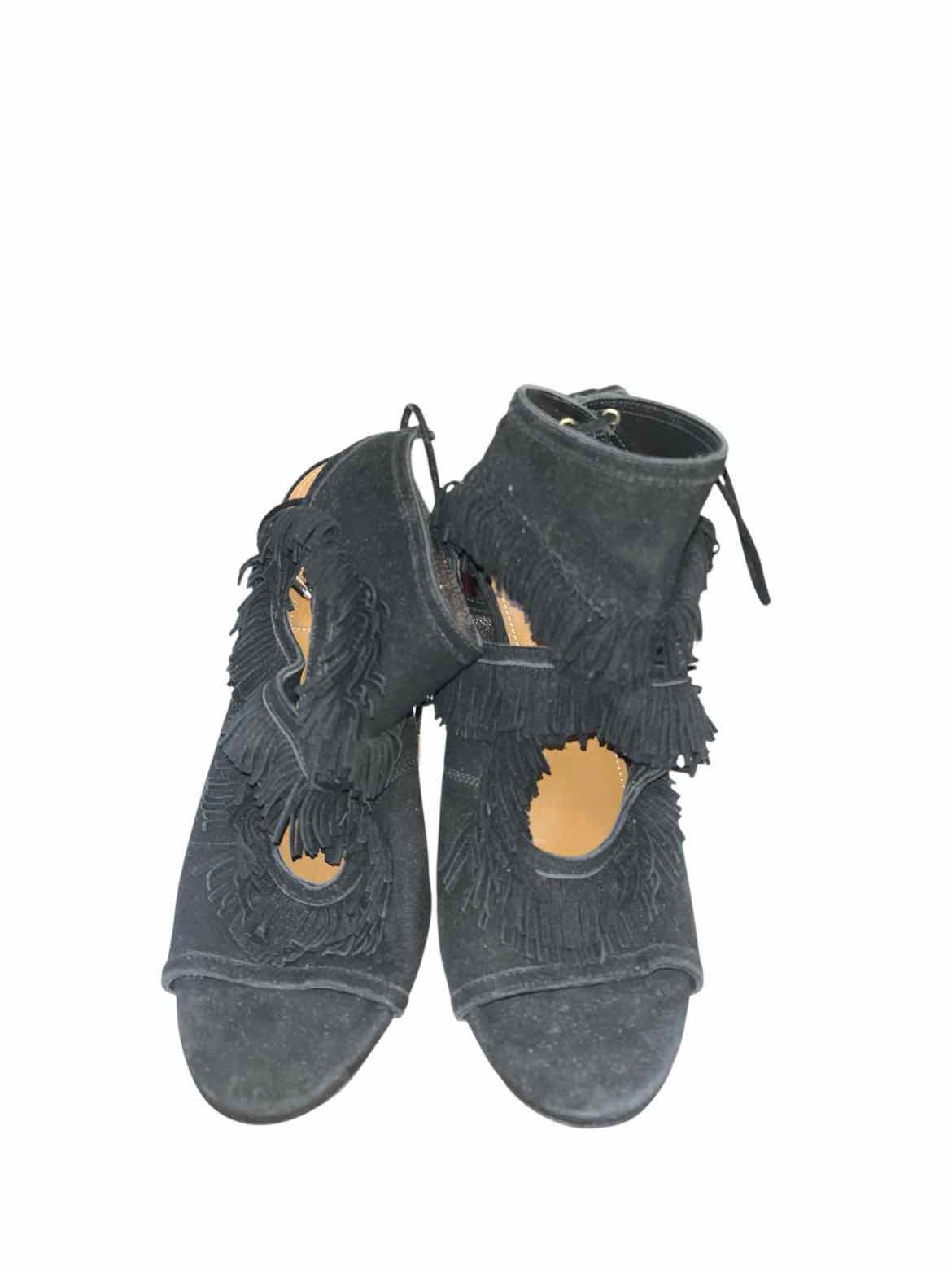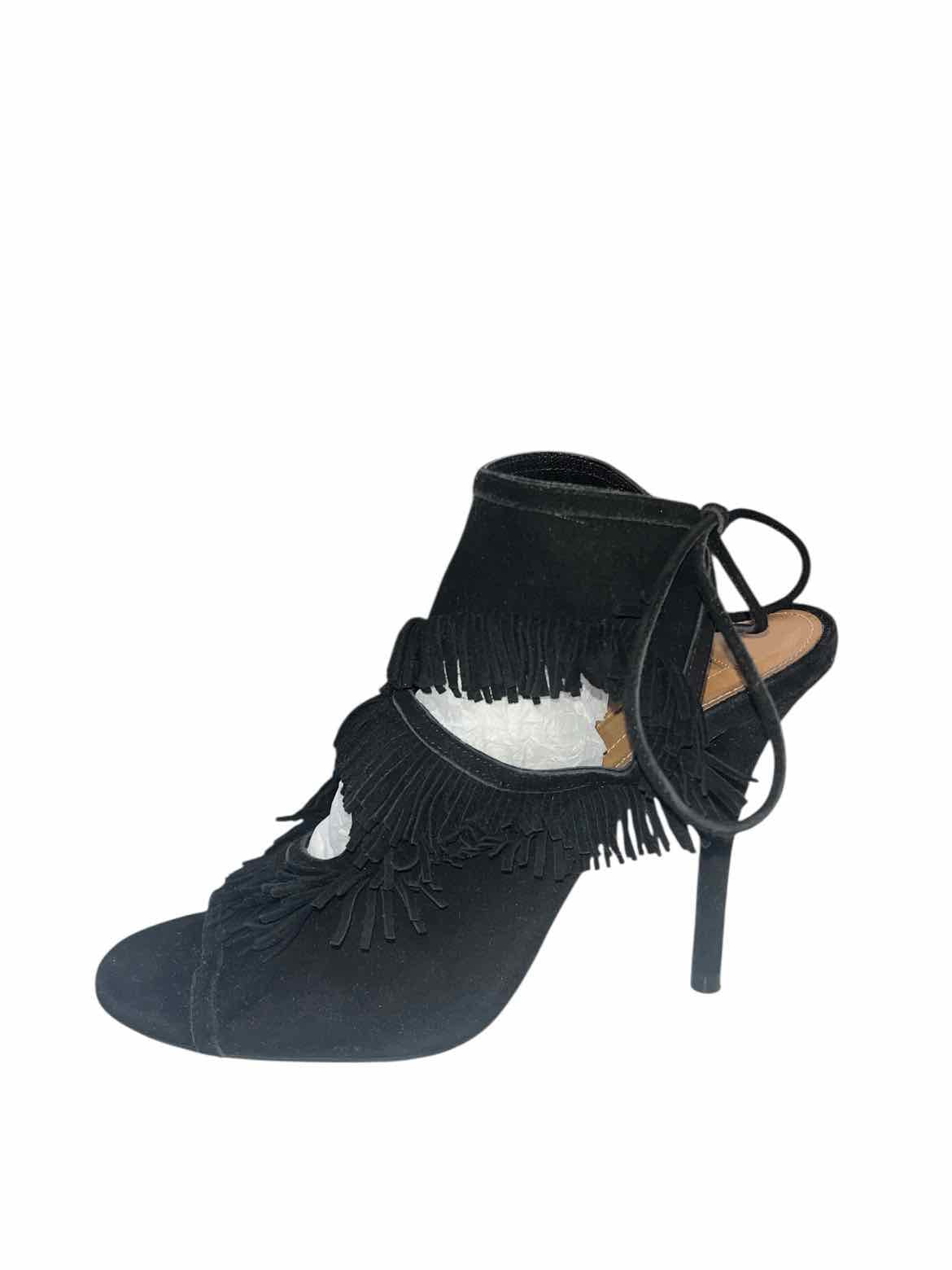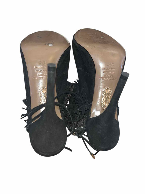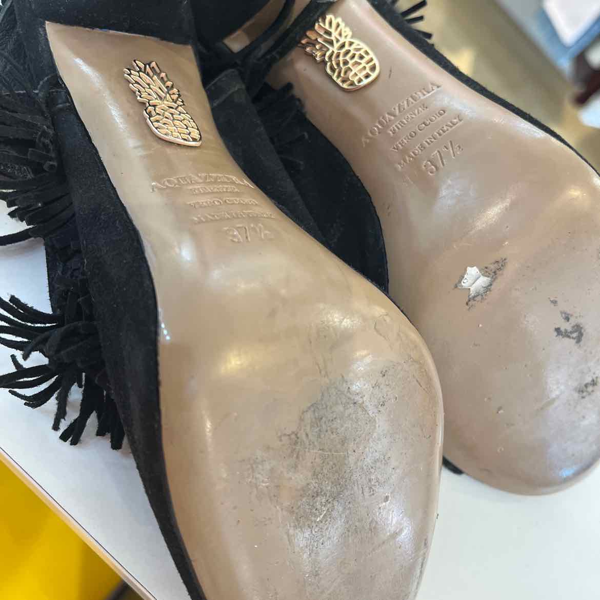 Featuring a chic peep-toe silhouette with strappy ankle and fringe front cutouts, the Aquazzura Black Size 37.5 Shoes are a beautiful choice for any lover of authentic luxury resale. Crafted from soft black suede and available in women’s European size 37.5, this pre-loved designer pair reflects refined details and polished craftsmanship. Carefully curated in very good condition, these exceptional shoes offer a unique opportunity to refresh your consignment fashion wardrobe with a notable accessory from a renowned brand. Experience the allure of women’s consignment fashion with this striking Aquazzura design.