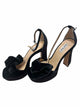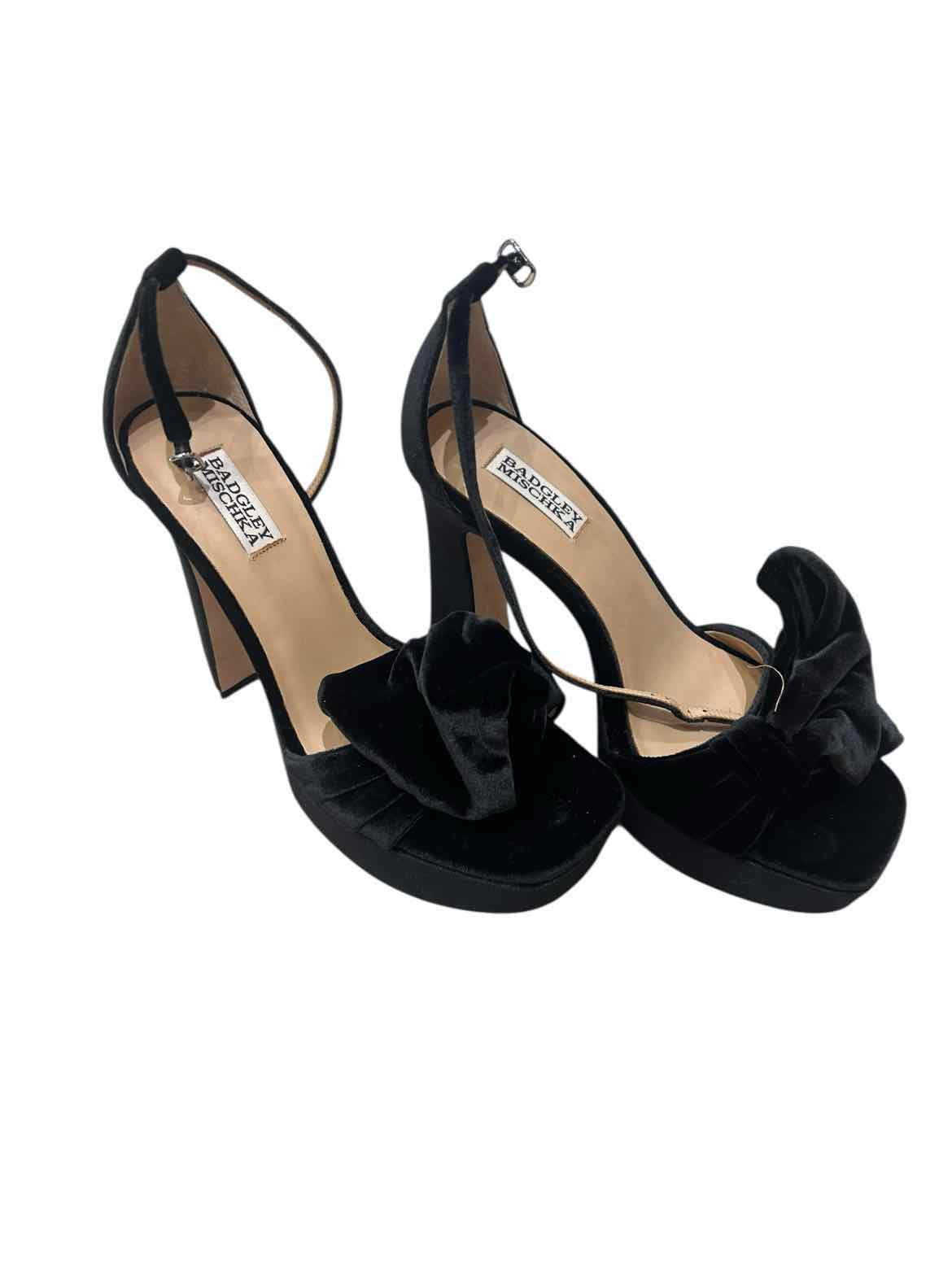 Featuring a striking silhouette, these Badgley Mischka Black Size 8.5 Shoes offer distinctive style for any women's consignment fashion collection. Designed with a bold platform heel, supportive block heel, and a secure ankle strap, this pair captures refined designer detail with a playful bow accent on the front strap. The open toe design and felt fabric in classic black add both elegance and versatility, making this pre-loved designer footwear an exceptional choice for authentic luxury resale enthusiasts seeking polished, high-quality pieces.
