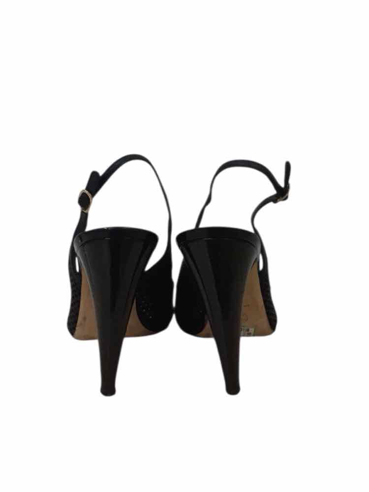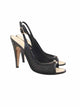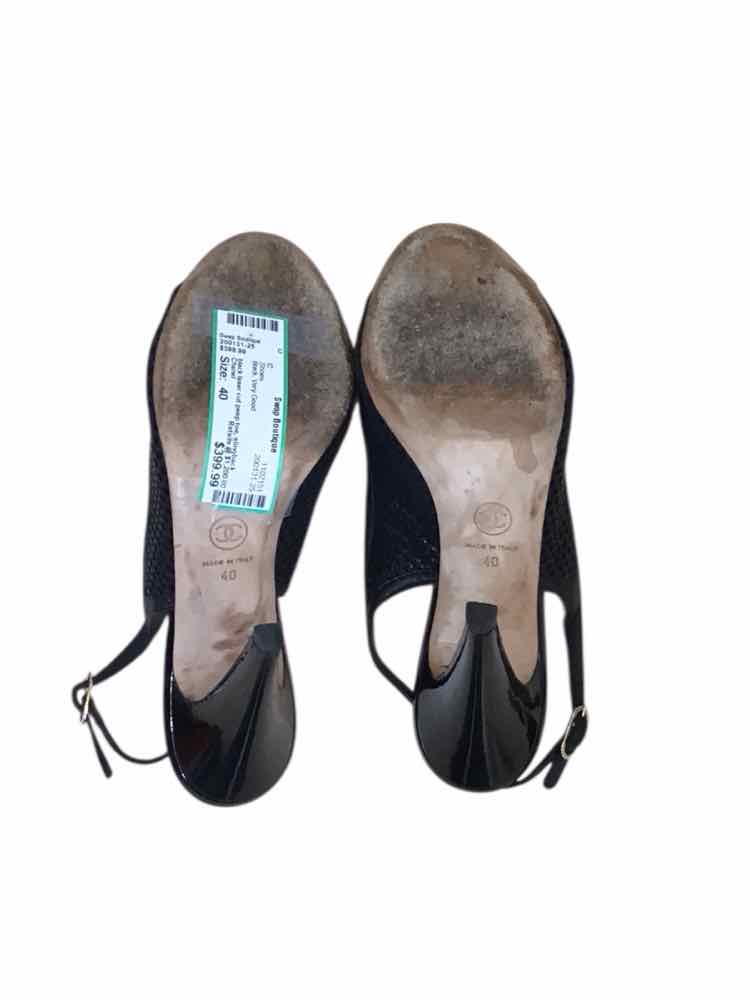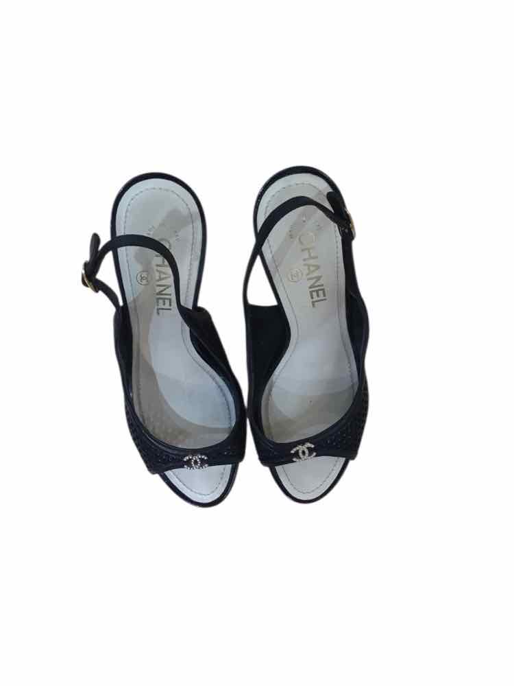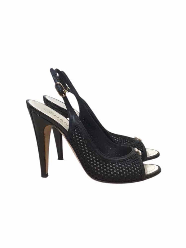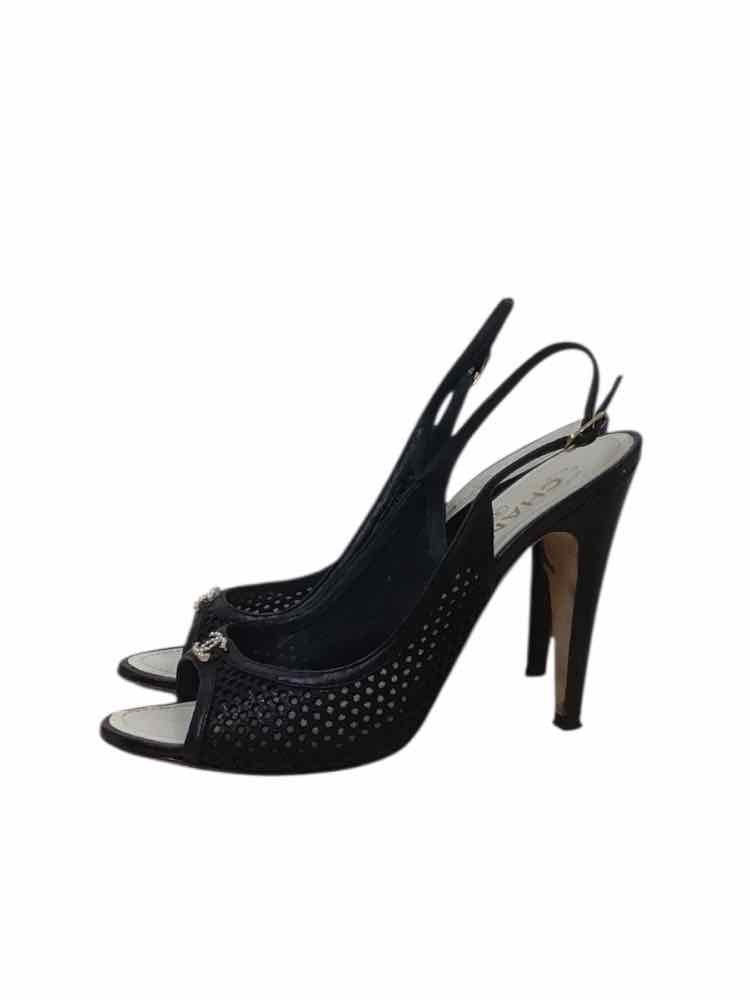The black laser cut design of these Chanel Black Size 40 Shoes brings a refined touch to any curated wardrobe. This pre-loved designer pair, available through authentic luxury resale, features a peep toe and slingback silhouette, enhanced by the iconic pearl CC logo detail and gold hardware. The solid black shade ensures versatility, making these pumps a chic addition for women's consignment fashion enthusiasts seeking a polished finish. Offered in very good condition, these Chanel shoes capture the timeless appeal and craftsmanship that define the brand’s legacy.