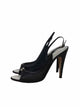 black laser cut peep toe, slingback pumps with a pearl cc logo detail, gold hardware, solid black