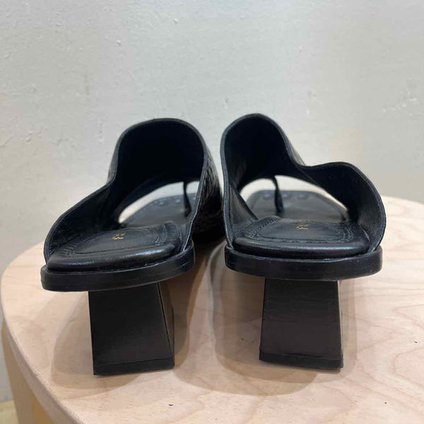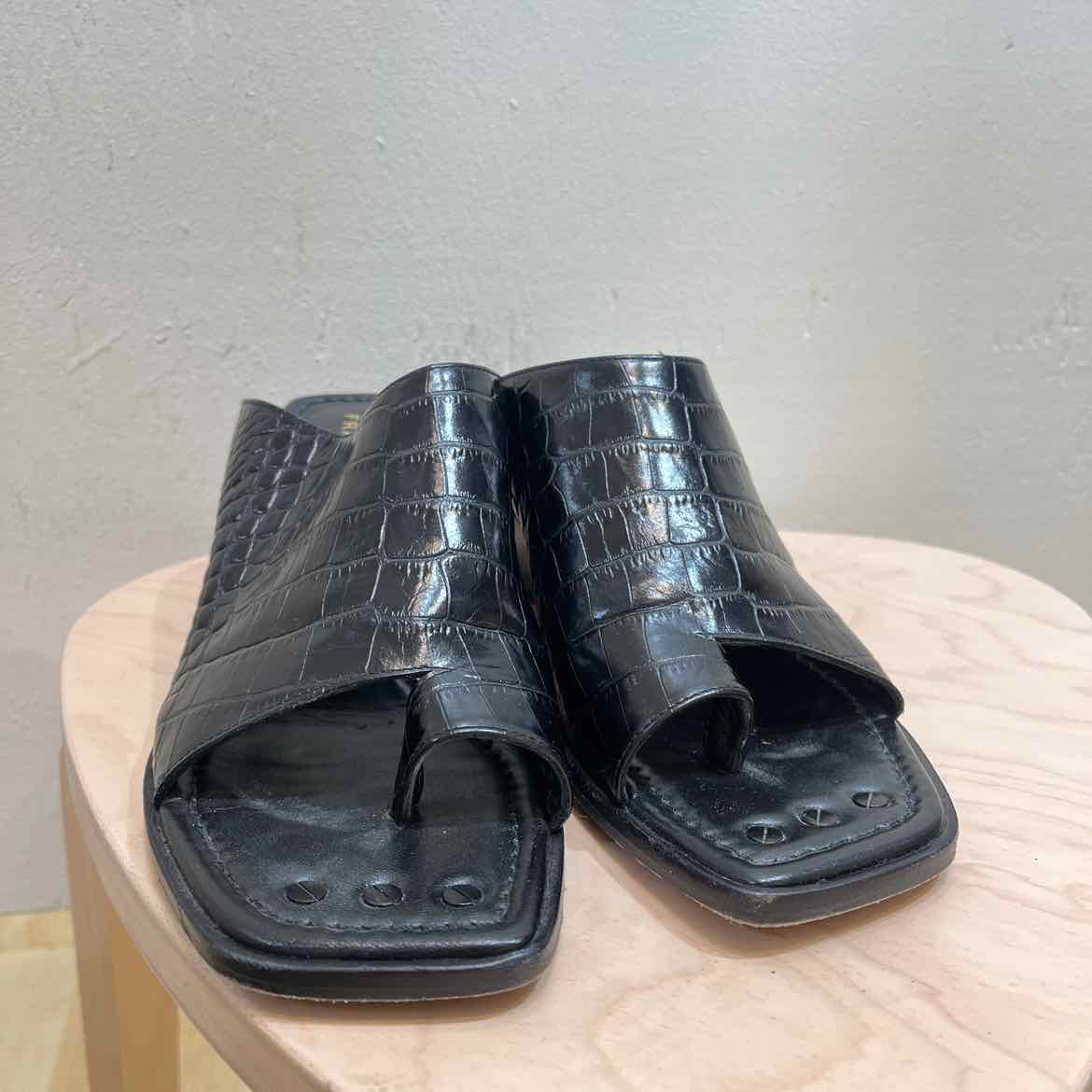 Featuring a contemporary silhouette, the Frame Black Size 39 Shoes are a striking addition to any women's consignment fashion collection. These pre-loved designer sandals display a square toe and block kitten heel, offering both comfort and modern appeal. The croc-embossed leather in classic black brings a refined edge, while the big toe front strap nods to exceptional detailing. Part of an authentic luxury resale assortment, this pair is in very good condition and ready to refresh your rotation with distinctive style. Discover how these chic mules can enhance your wardrobe with their remarkable craftsmanship and timeless versatility.