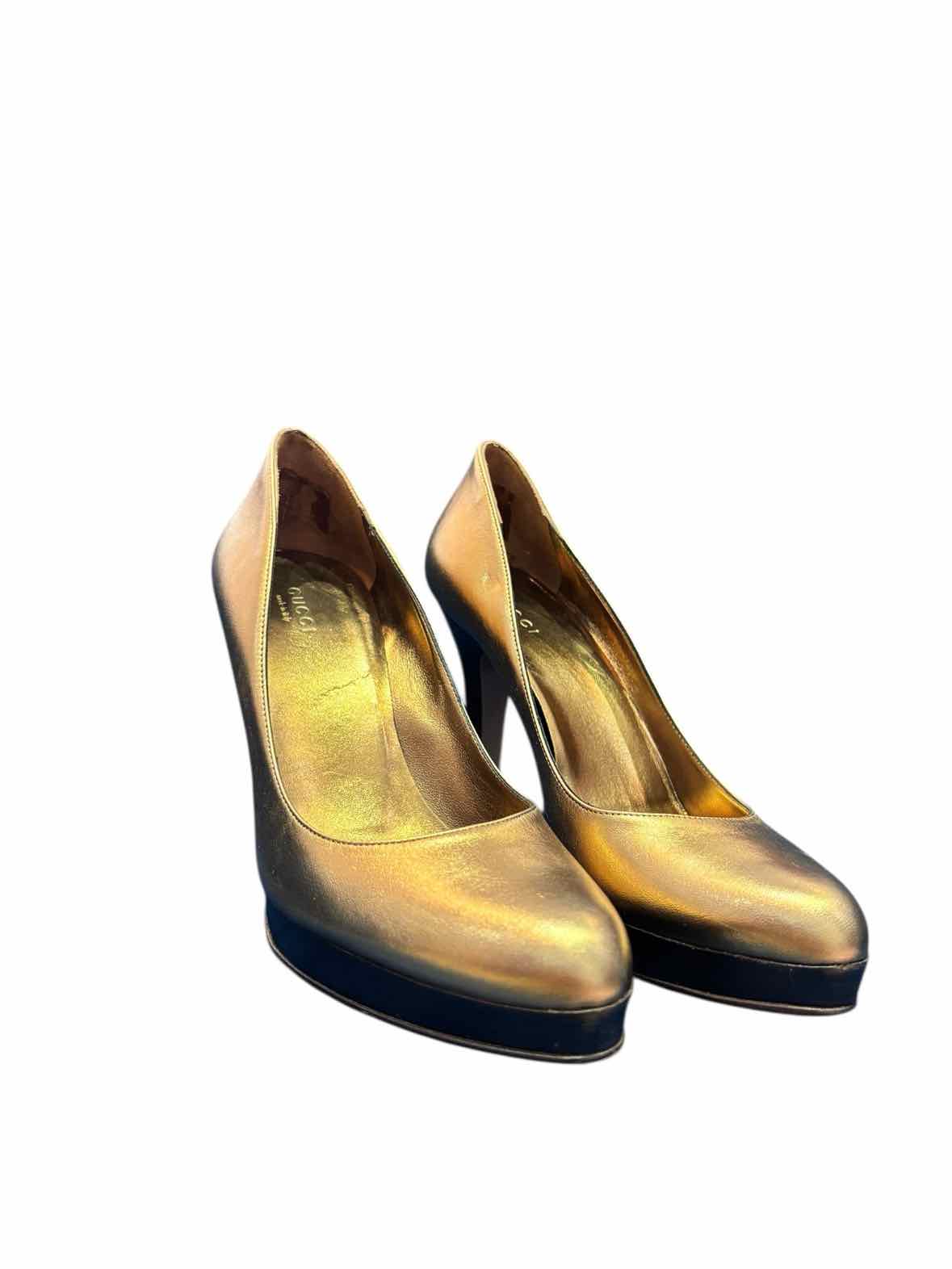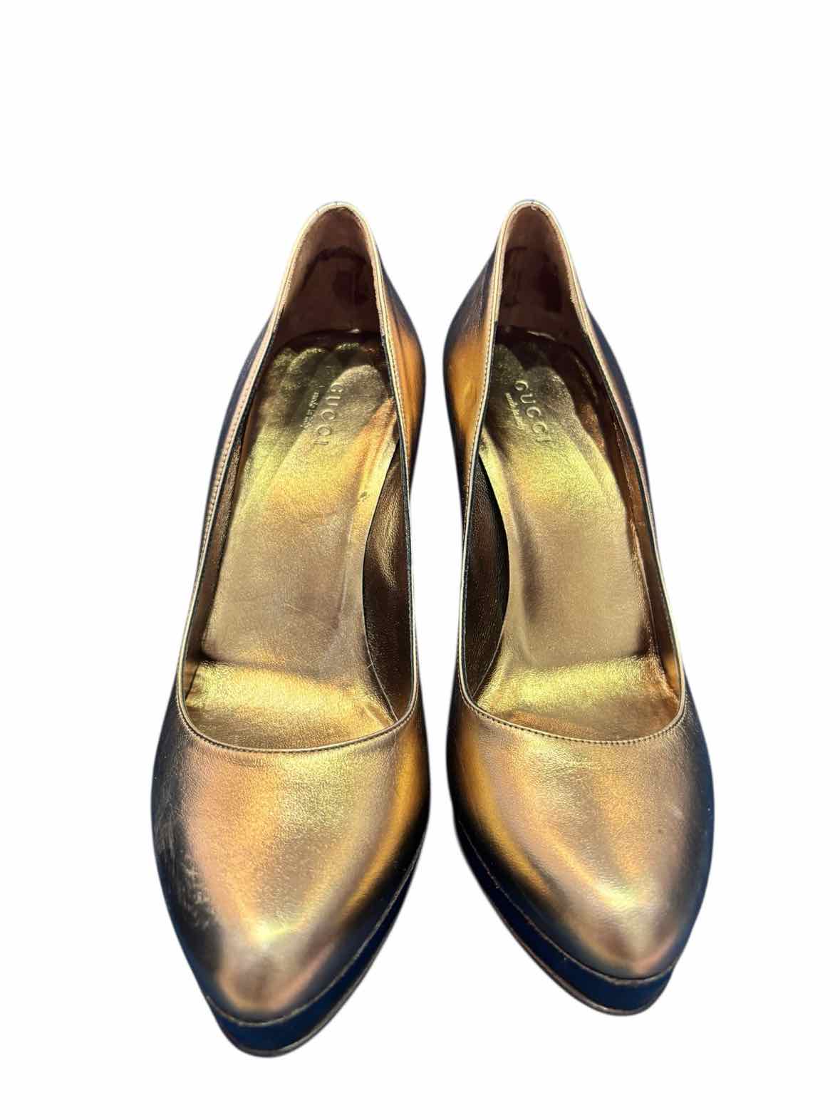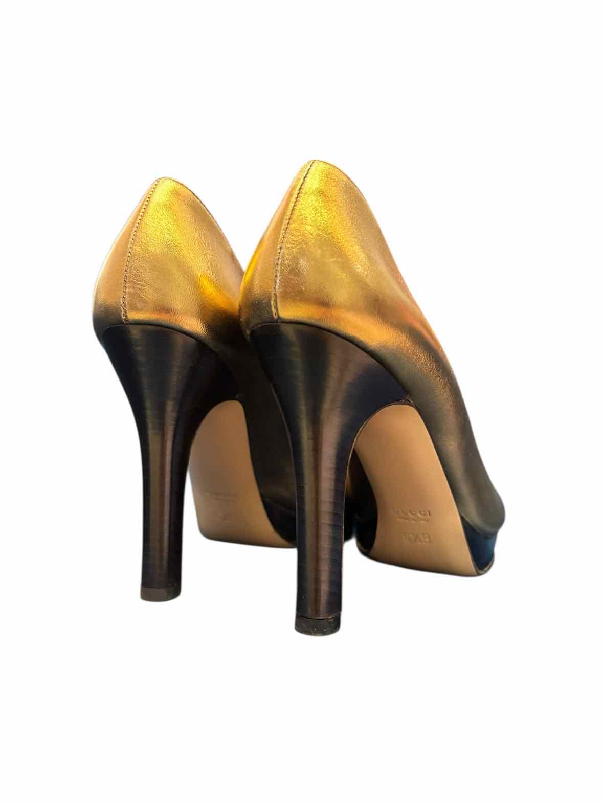 The color focus: The rich, shiny bronze of these Gucci Bronze Size 6.5 Shoes brings a distinctive and refined energy to any women’s consignment fashion collection. The slip-on design with a round toe and striking 4-inch black heel is both beautiful and functional, reflecting the essence of pre-loved designer style. As part of an authentic luxury resale offering, these shoes combine the polished appeal of Gucci with a unique metallic finish that is sure to complement your wardrobe. Experience the remarkable combination of iconic design and luxury at an accessible value.