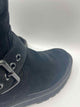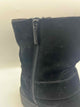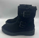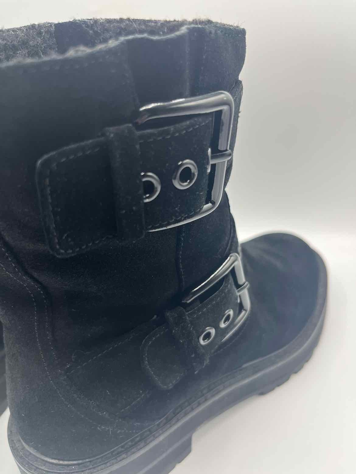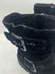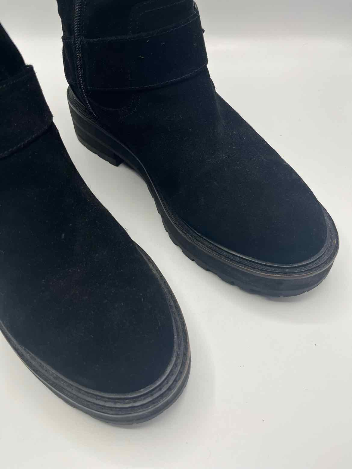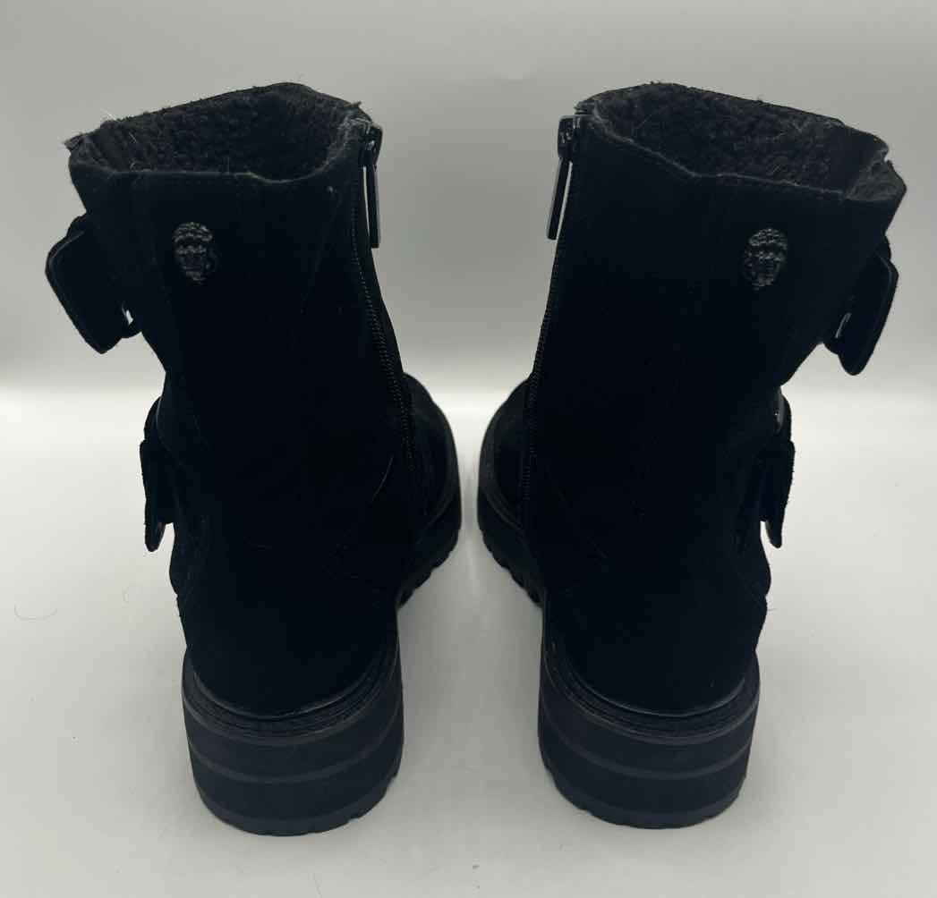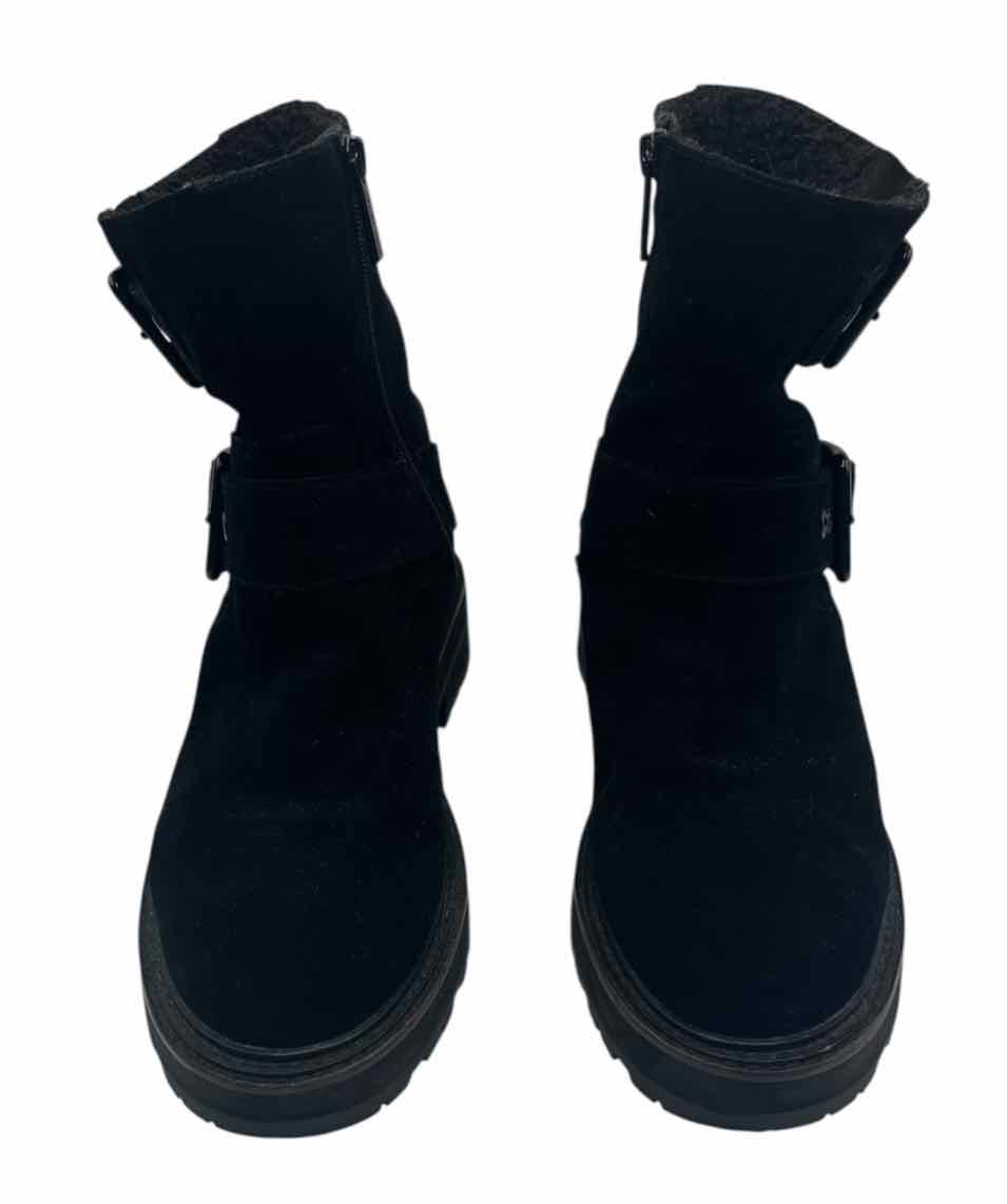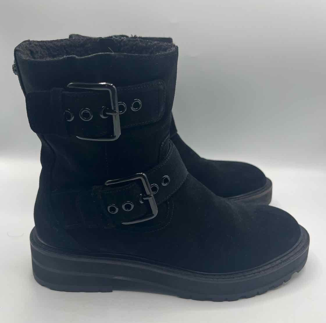 *pa for minor wear,closed round toe,solid black suede chunky booties,side zip,adjustable buckle strap,teddy lining,gunmetal hardware,'Hackney Biker Boot'