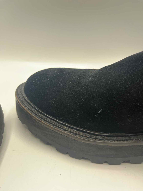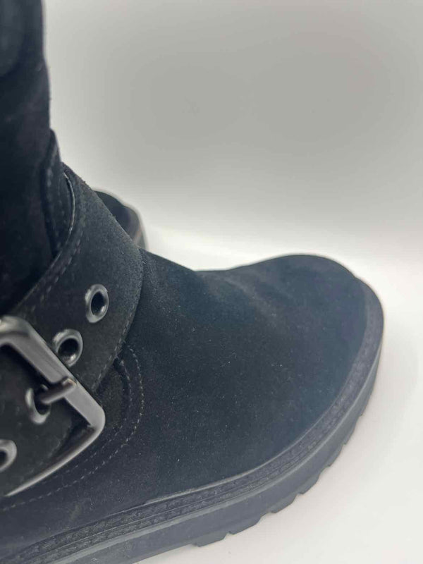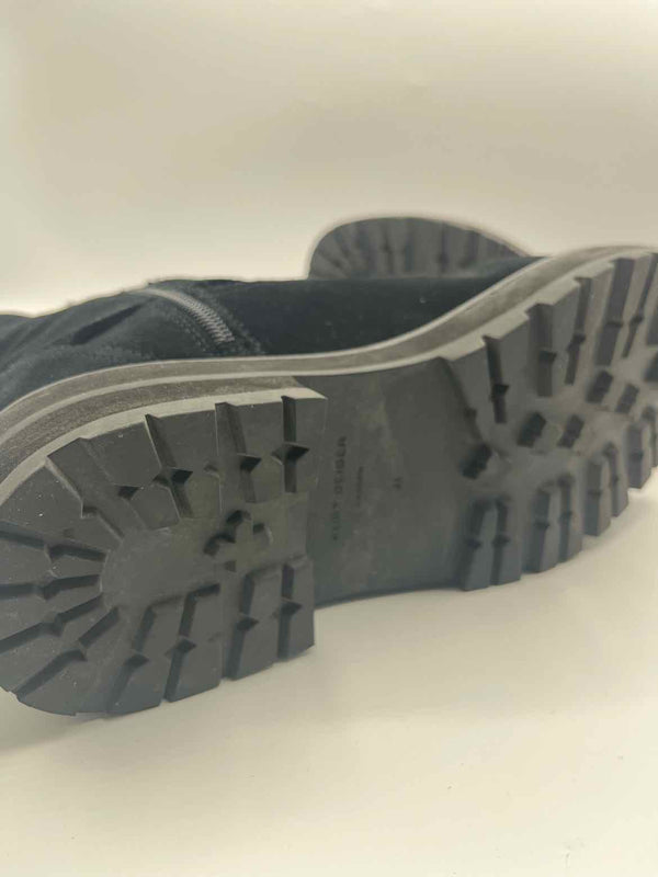 The rich black hue of these Kurt Geiger Black Size 41 Hackney Biker Boots makes them a versatile addition to any women's consignment fashion collection. Designed with a solid suede finish, chunky silhouette, and detailed with gunmetal hardware, this authentic luxury resale piece brings together durability and contemporary style. The closed round toe, side zip, and adjustable buckle strap provide both comfort and practicality, while the teddy lining adds warmth for cooler days. As a pre-loved designer boot in very good condition, this pair demonstrates the blend of fashion-forward edge and timeless quality Kurt Geiger is known for.