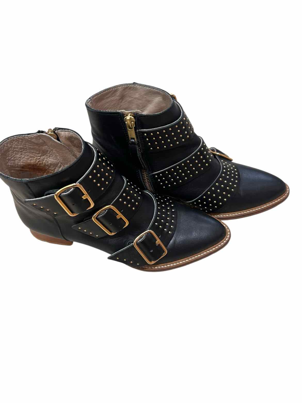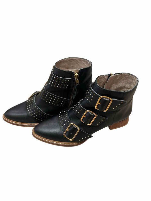 Featuring a modern ankle boot silhouette, the matt bernson Black Size 6 Boots bring a blend of chic design and authentic luxury resale to your footwear collection. Crafted with smooth black leather, these pre-loved designer boots highlight distinctive gold stud and buckle accents on the straps, a pointed toe, and a classic wood heel. A convenient side zip ensures easy wear, while the refined detailing makes them a unique find in women’s consignment fashion. Enjoy the confidence of curated style and quality with these boots, sourced for those who appreciate timeless designer footwear.