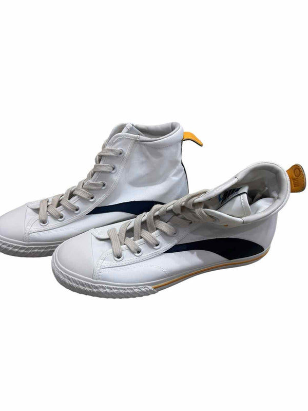 The color combination of the oncept White and navy Size 9.5 Shoes brings a fresh approach to women’s consignment fashion. White and navy hues are complemented by vibrant yellow accents, while the high top silhouette and crisp white laces add a modern edge. Available through authentic luxury resale, these pre-loved designer sneakers are new and ready to enhance your collection. Whether you’re searching for a unique addition to your wardrobe or a special find from the world of curated footwear, this pair is a notable choice for style-minded individuals.