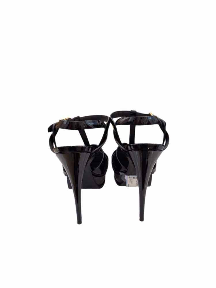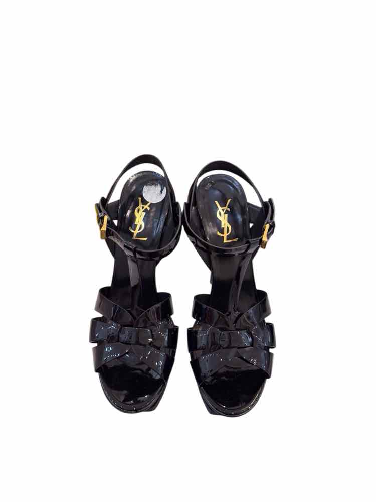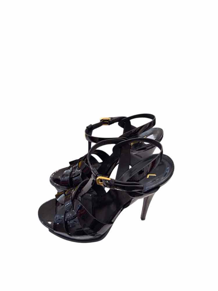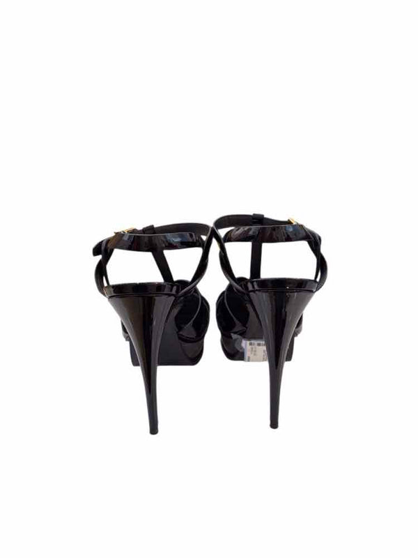 Authenticated and carefully curated, these Saint Laurent Black Size 39 Shoes deliver the refined edge of authentic luxury resale for women’s consignment fashion. Designed with a Tribute platform heel, open toe, and accented with gold hardware, this pre-loved designer pair is crafted from patent leather in a solid black color for a polished look. Offered in very good condition and accompanied by a dustbag, these shoes are a beautiful example of Saint Laurent’s attention to detail and timeless style. Experience the blend of modern design and classic elegance with this notable addition to your collection.