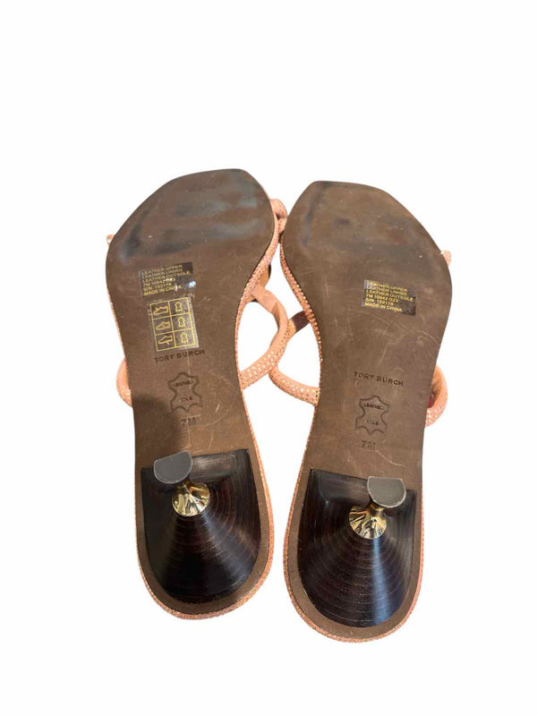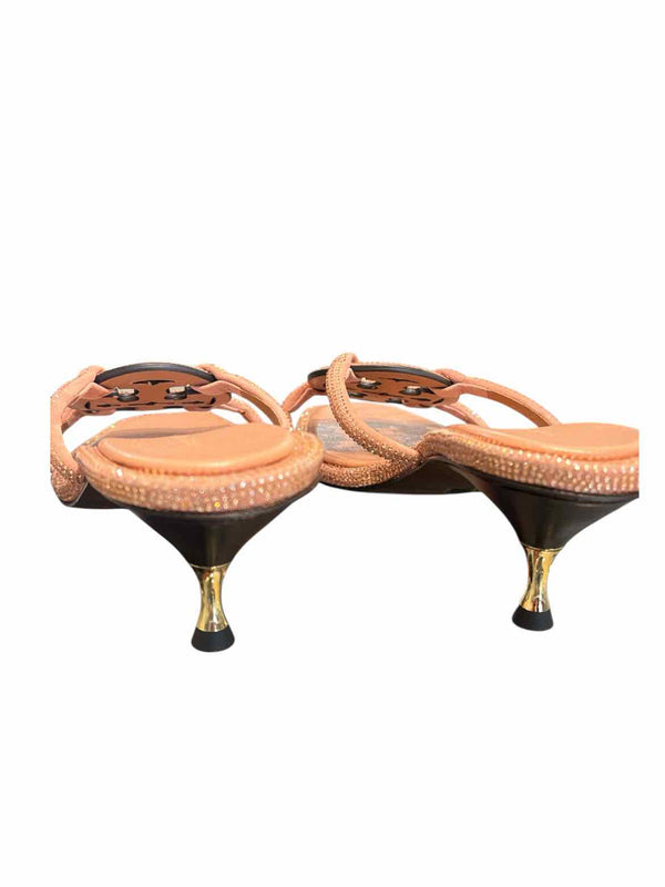 Crafted from supple leather, these Tory Burch Pink Size 7 Shoes blend refined style with eye-catching details. The beautiful pink color and shimmering rhinestone crystal embellishments bring a touch of luxury to your collection of pre-loved designer footwear. With a chic heeled silhouette, open toe, and easy slip-on design, this authentic luxury resale find is both comfortable and elegant. Ideal for those who appreciate women's consignment fashion, the shoes are in very good condition and offer a polished finish for any occasion. Add a unique piece from Tory Burch to your wardrobe with this striking pair.