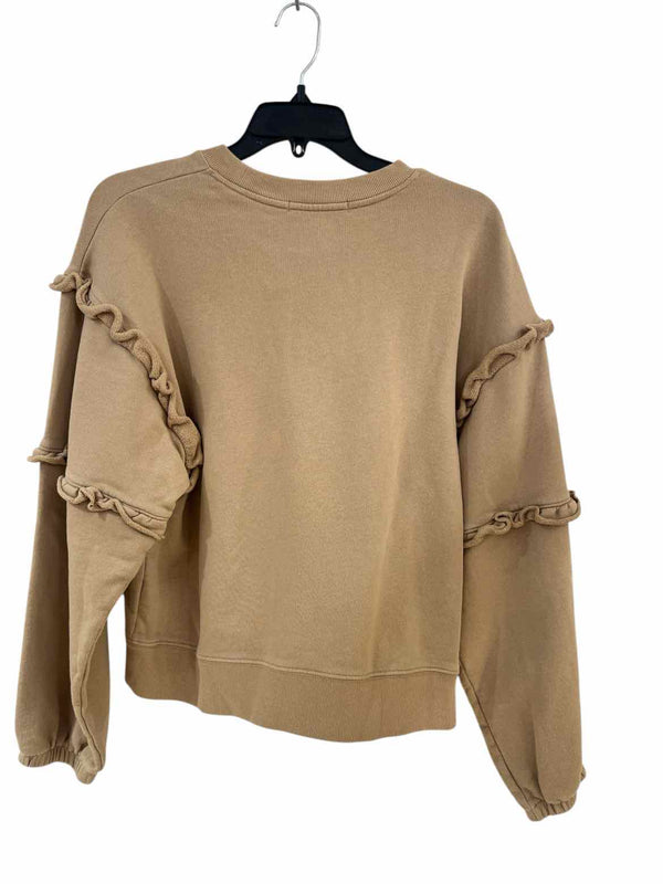 Crafted from 100% cotton, this Rebecca Minkoff Light Brown Size M Shirt brings comfort and a touch of feminine detail to women's consignment fashion. The light brown hue offers versatility, while the crew neck and long sleeves make it suitable for various occasions. Ruffle accents along the sleeves and a cuffed bottom add a polished finish to this pre-loved designer piece, curated for authentic luxury resale. In very good condition, this shirt is an ideal choice for those seeking quality and style in their wardrobe refresh.