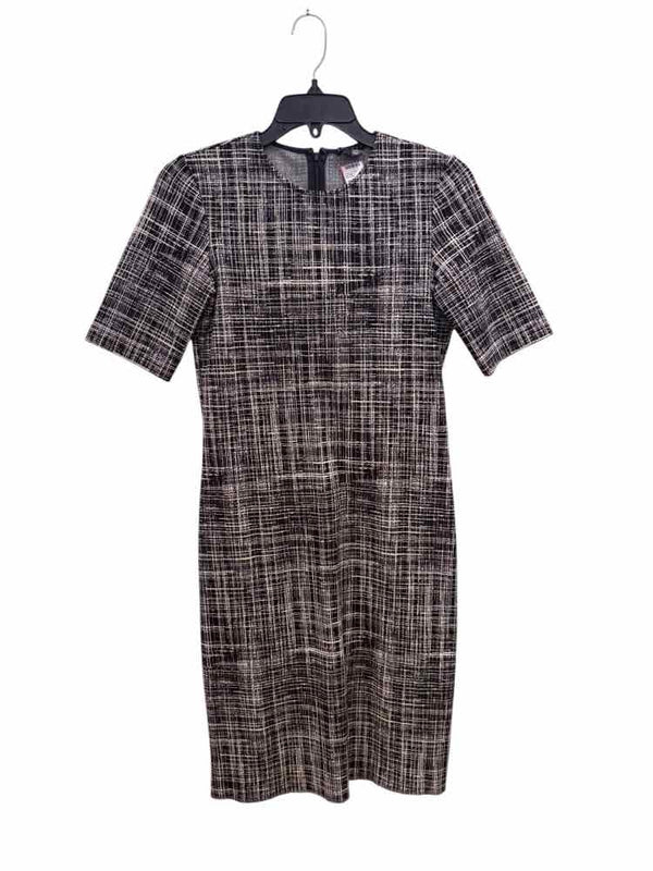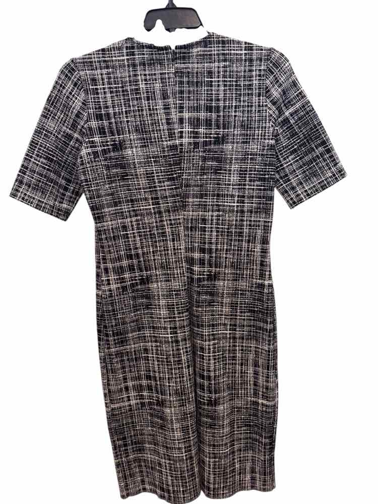 s/slv midi dress, form fitting and complementary to body, black and white design