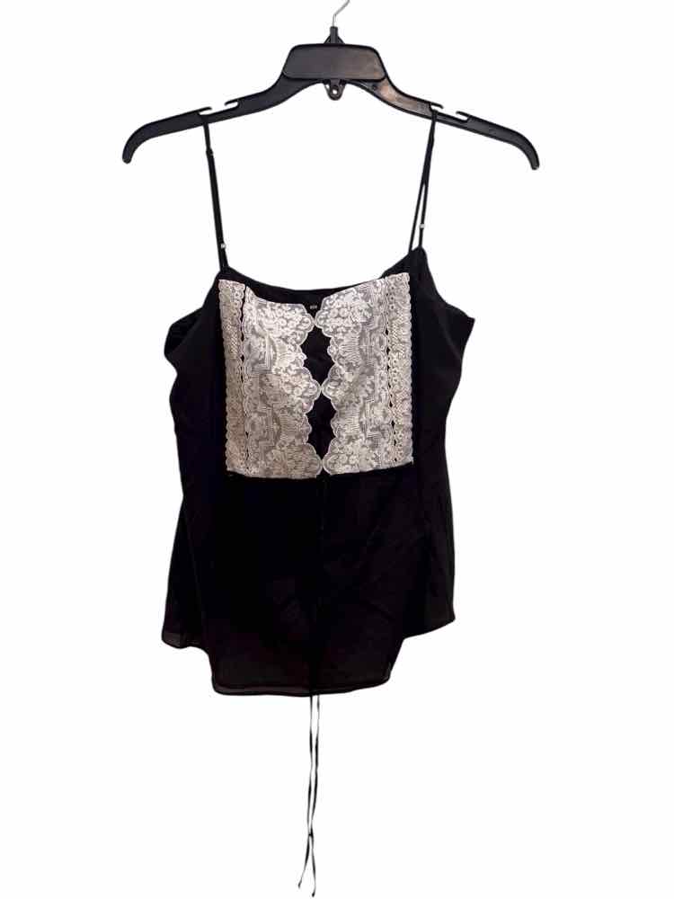 spaghetti straps, loose fit, slight cropped, lace design in white in front, black base color