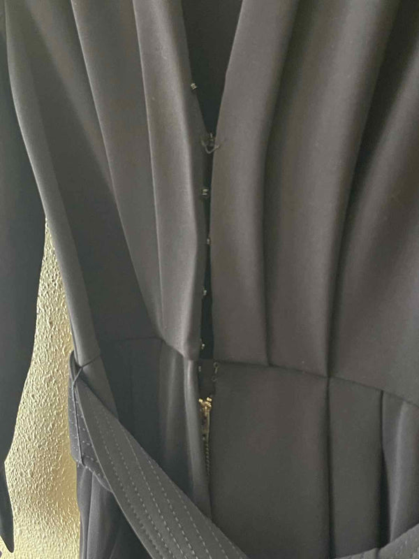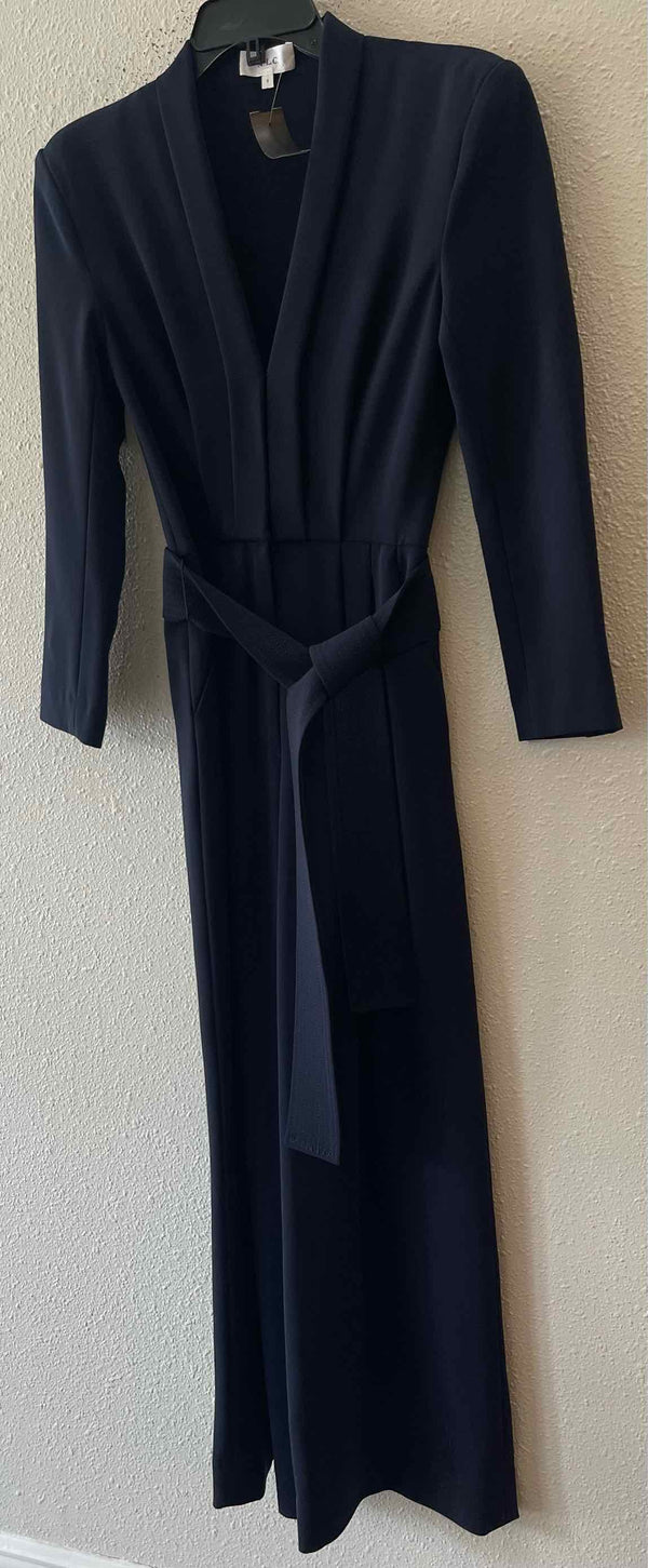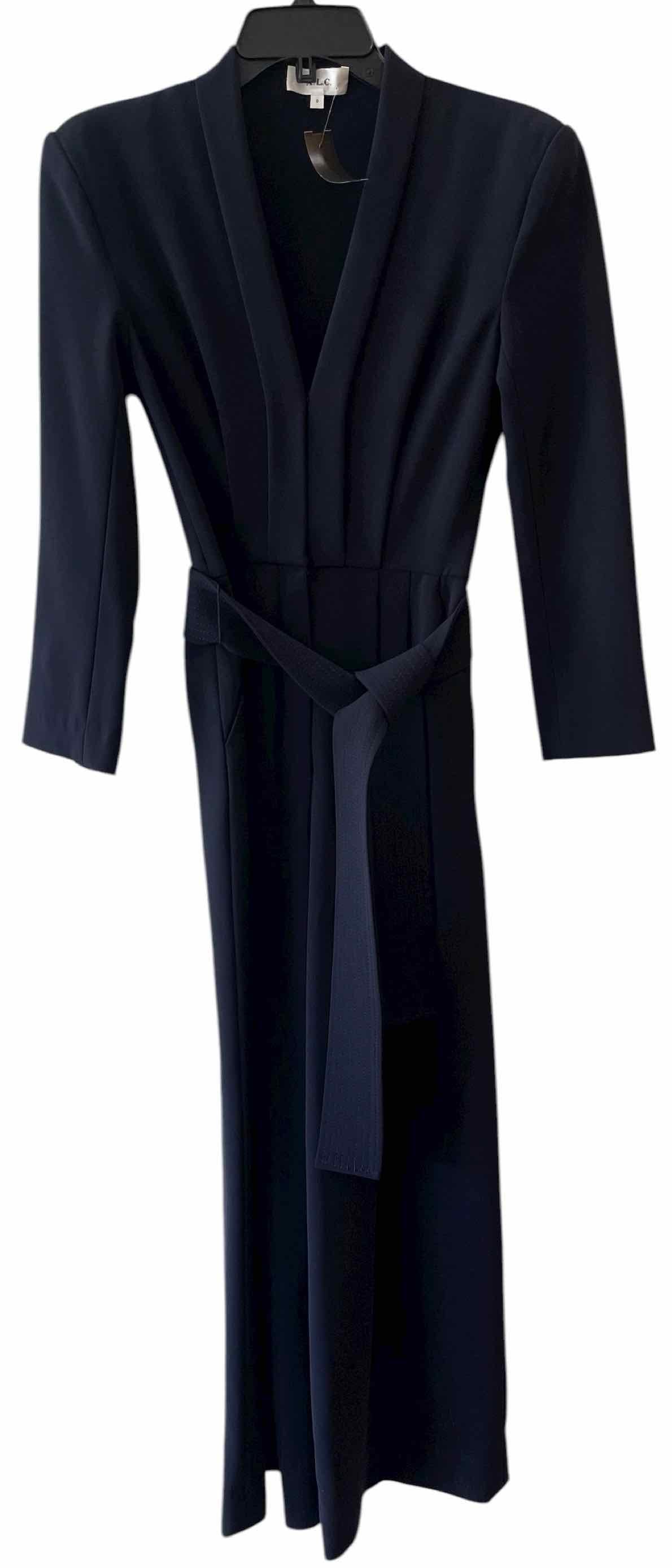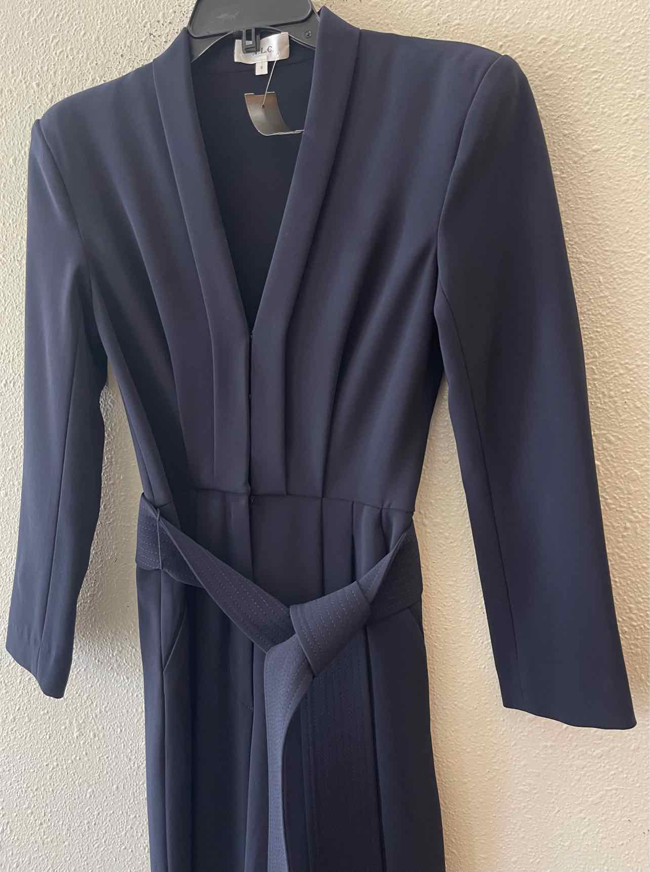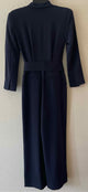 long sleeve,plunge v neck,wide legsolid navy,Kieran II padded shoulder jumpsuit,pleated placket with multi front hook closure,on seam pocketspadded shoulders,removeable belt,fuax baxk slit pockets