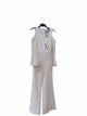 long sleeve, long pants, solid white, cut outs on shoulders, black fabric buttons in front, flared pants