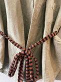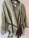 rolled quarter sleeve, sage green textured design, open jacket with brown/navy striped knit belt