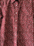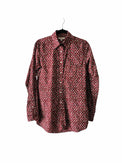 Long sleeve,collared,button down,multicolored abstract overlapping webbed prism bubble design throughout,chocolate,red,pink,white,button cuff sleeves